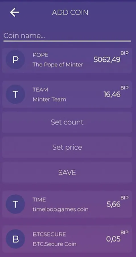 Create your portfolio of any coins, specifying, if necessary, the available quantity and the price at which they were purchased. Track the total portfolio value in BIP and dollars.