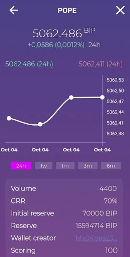 Learn the parameters of the added coin. Its volume in the market, CRR, initial reserve, current reserve, wallet of the coin creator and the assessment of trust to this wallet on a 100-point scale.