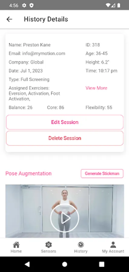 Motion specialists screen a client using the MyMotion Business App. Three targeted exercises are presented as a result of the screening process, processed by the revolutionary MyMotion "human code" and AI.