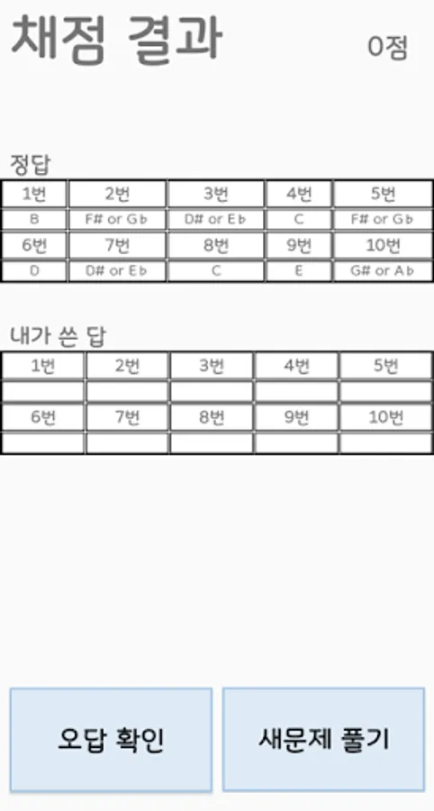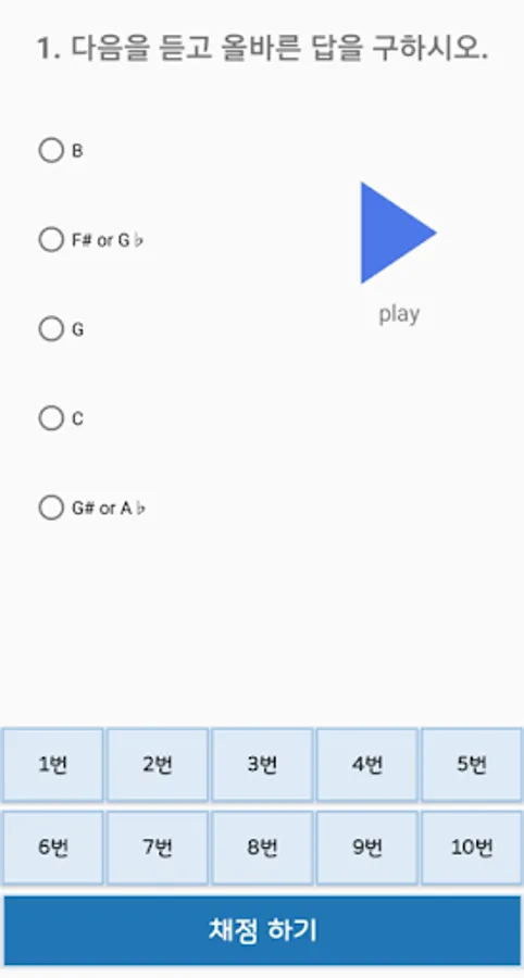 시험모드는 10개의 문제를 랜덤으로 생성하며, 문제당 하나의 음을 직접 골라 자신의 청음 실력을 테스트할 수 있습니다.