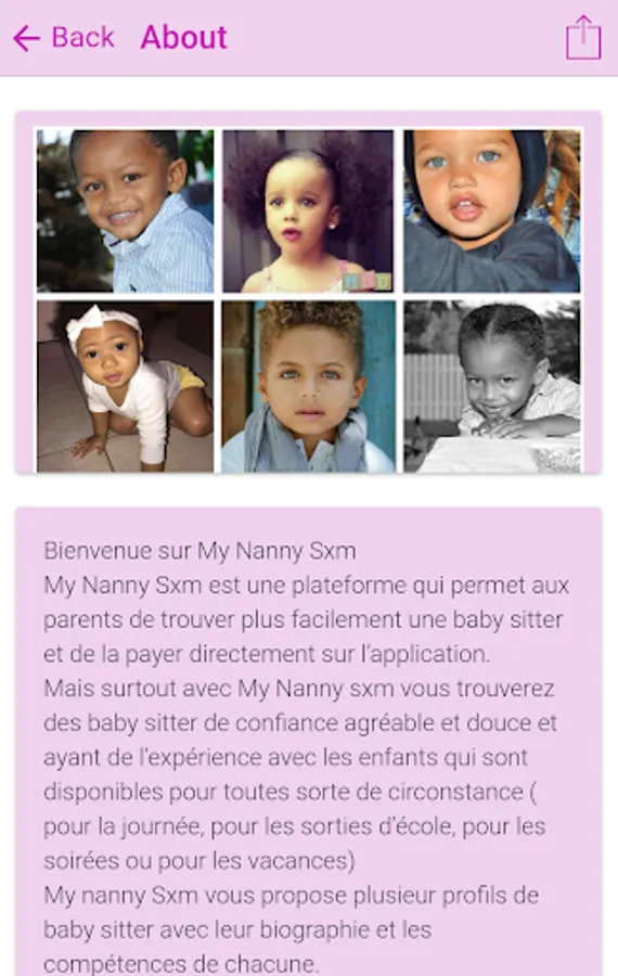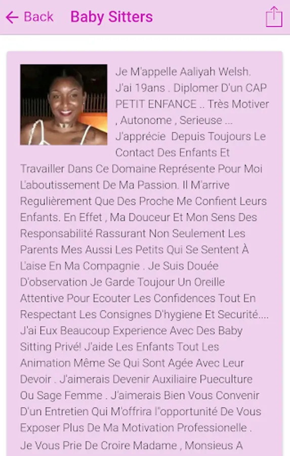 The app allows you to view the profile of each baby sitter with their biography and respective skills.