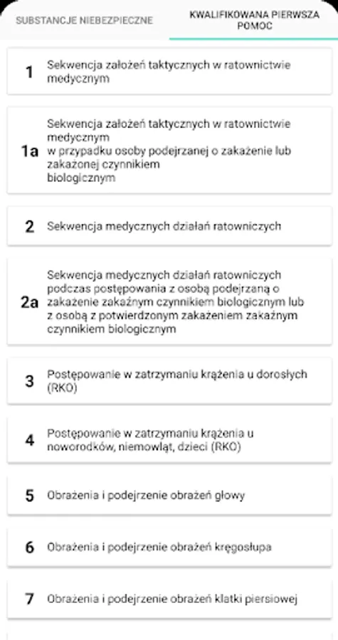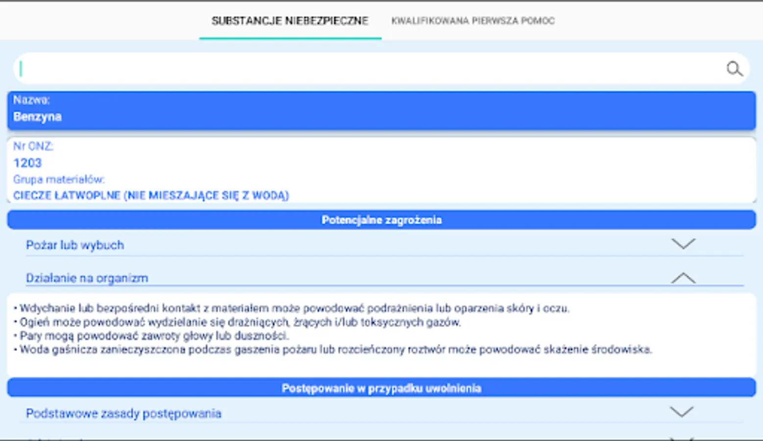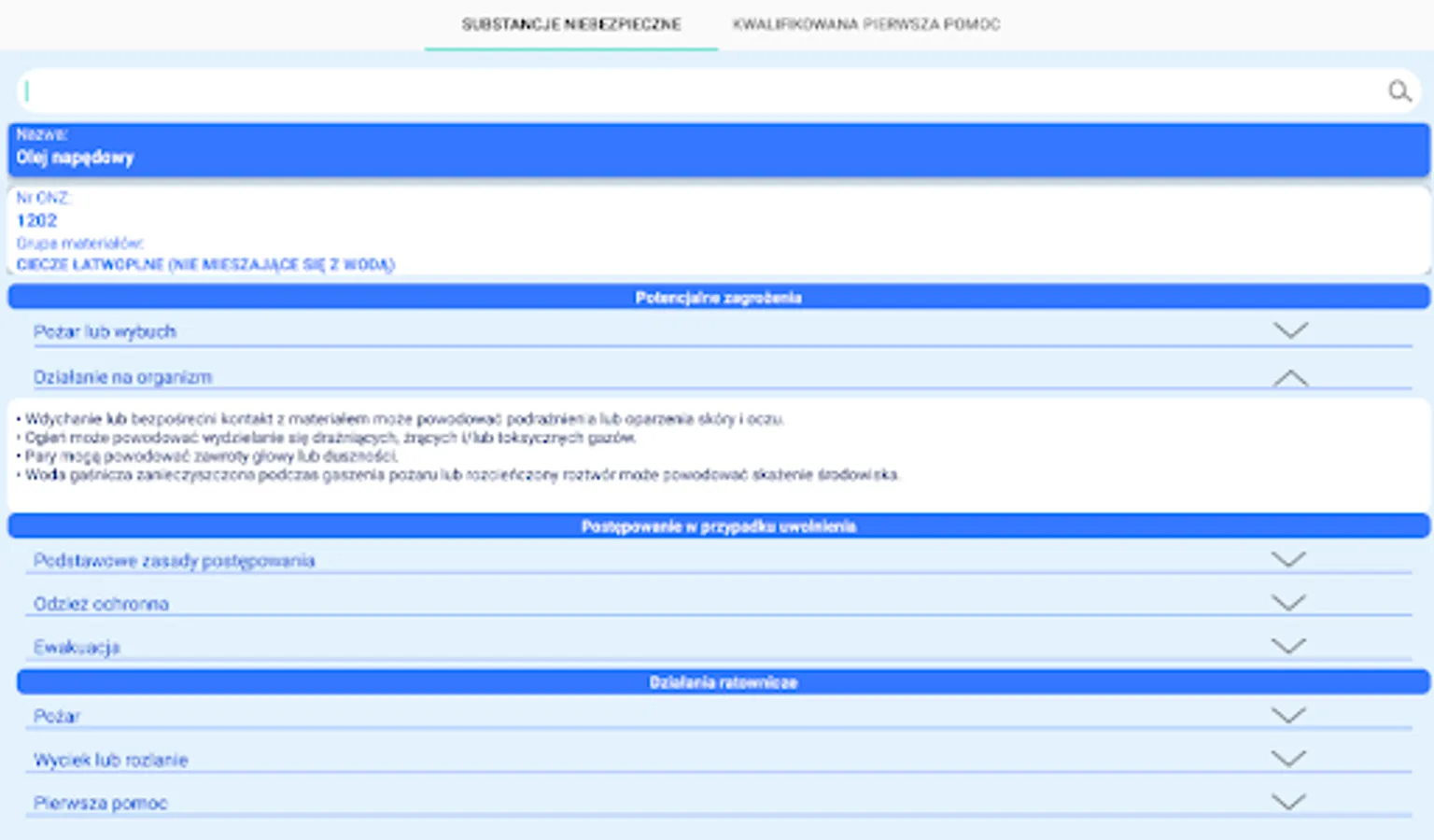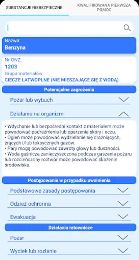 The application presents rescue procedures in the event of a dangerous situation related to hazardous substances. It also allows a substance to be identified by its UN number or name. The procedures for chemical and ecological rescue presented in this application are used for actions by KSRG rescuers in the first 30 minutes from the failure. The main document on the basis of which the procedures were developed is the "Principles of rescue procedure 2016" issued by the Chief Inspectorate of Environmental Protection. In addition, the application contains a list of current Qualified First Aid procedures in the form of diagrams.