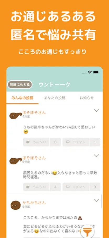 A poop SNS function that allows you to talk about anything that is difficult to talk about in real life, such as constipation and diarrhea, and sharing information on intestinal health, beauty, and diet. Let's wash away the constipation of the heart!