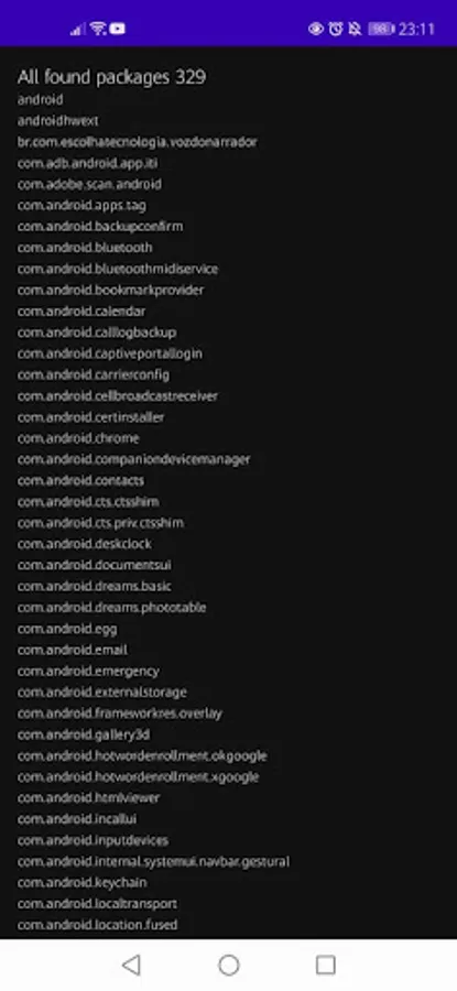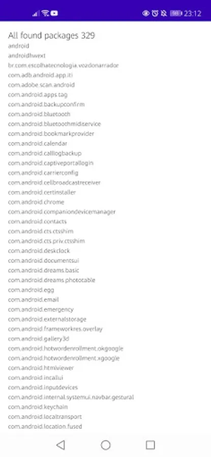 The app is displaying all installed packages, alphabetically in the scrollable list.