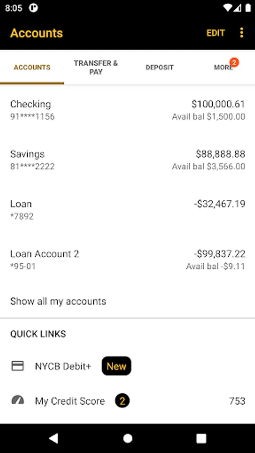 3Deposits made via NYCB Mobile Deposit may appear real-time in Transaction History however availability of funds is subject to Bank review. Deposit limits apply.