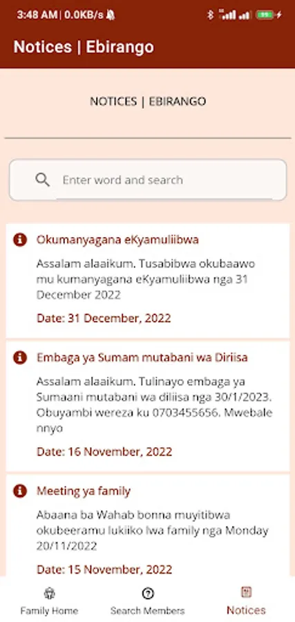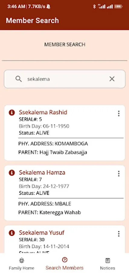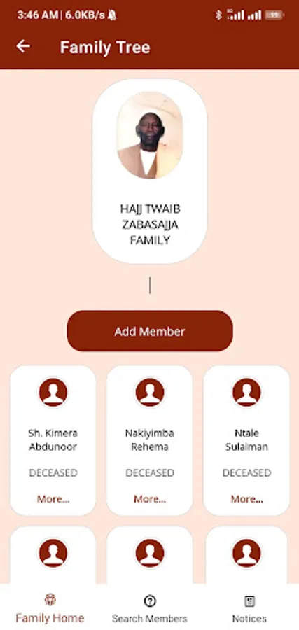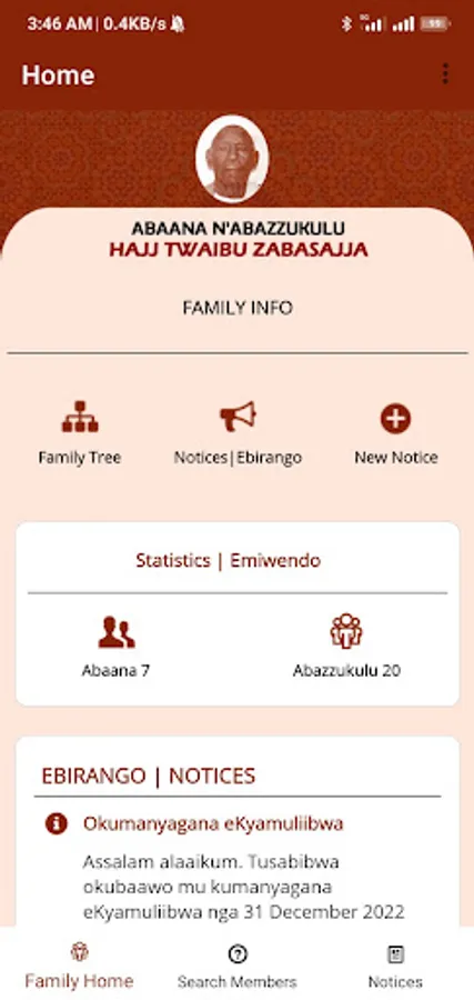 Hajj Twaib Zabasajja Family App enables a member to browse the family tree right from our grandfather, Hajj Twaib to the lowest level available today. It also supports photo and location info plus posting and viewing annoucements