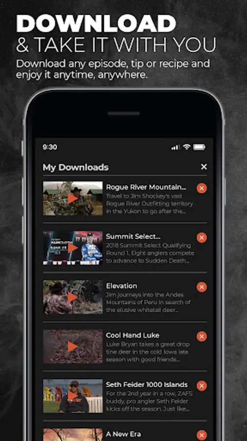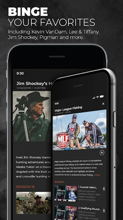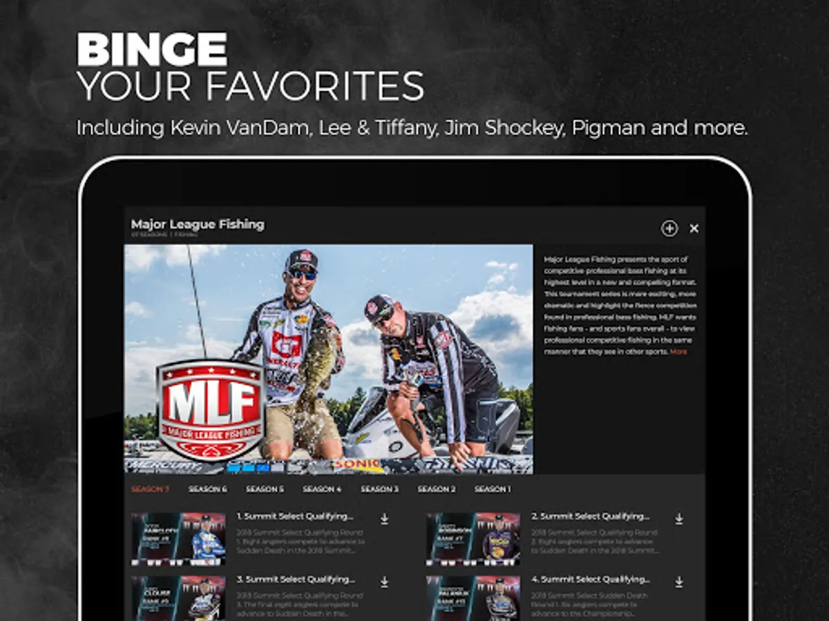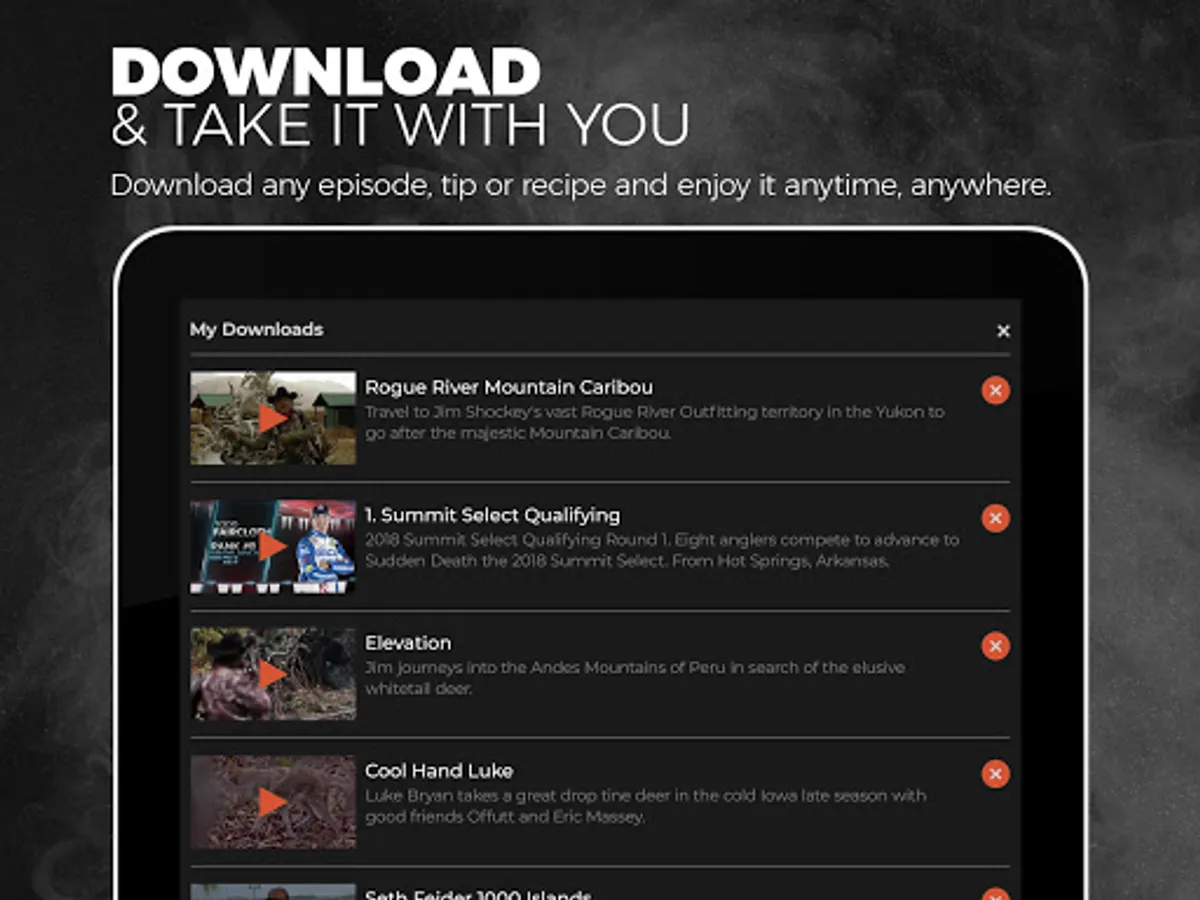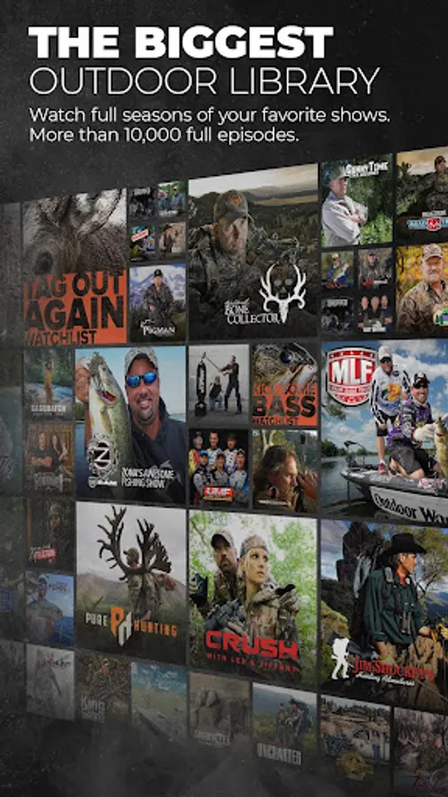 Watch the best and most popular shows like: Major League Fishing (MLF), Drury Outdoors, The Crush, Pigman, Bone Collector, Jim Shockey’s Uncharted, and many more. If you enjoy watching outdoor or in the wild tv shows, MyOutdoorTV is the place to be. In addition, you’ll enjoy our episodes on 'Tips & How To’s’ , Hunting and Fishing Recipes from Outdoor Channel and Sportsman Channel. Start your FREE Trial today.
