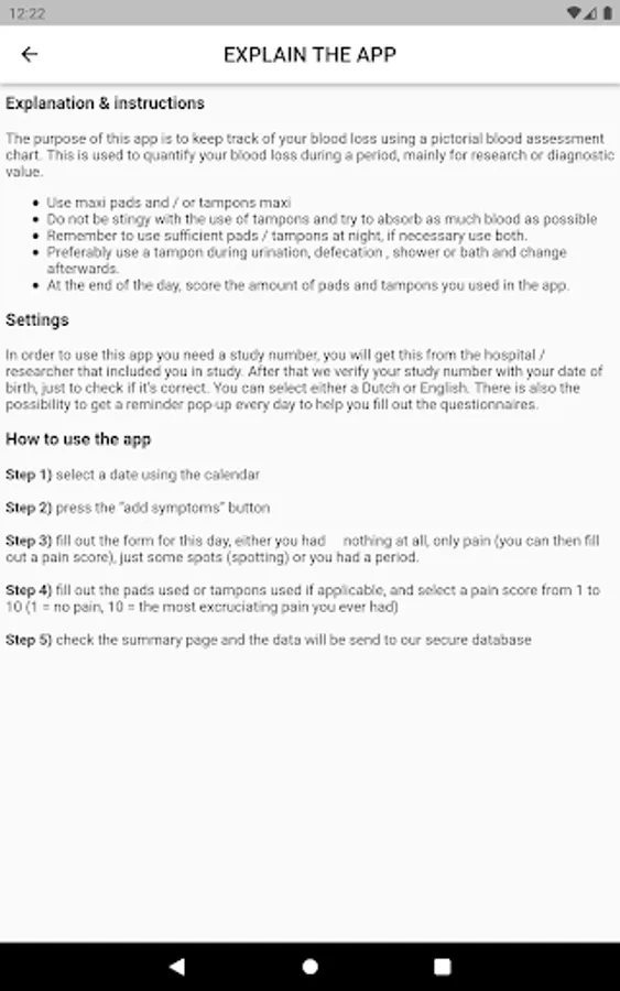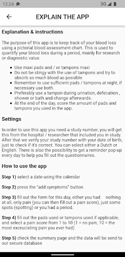 This app is a menstrual calendar with the aim to support research on the growth of fibroids. It is not possible to use this app if you do not participate in the Myovasc study. For questions about the app, please contact the researchers team.