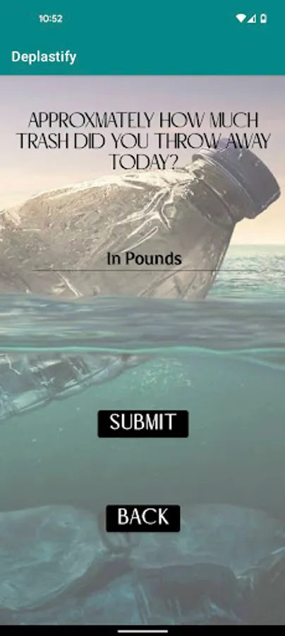 Deplastify’s goal is to increase the user’s awareness about how much plastic waste they are making and give them a tool to track and see improvement in how much plastic waste they are making. In addition to the user tracking their own waste, all users of the app will be sending anonymous data (waste count in pounds) to a server. This data would be collected and then scientists, environmentalists, or anyone else can see the data and do their own study with it. It will be helping users to track their own waste and help them with studies done across the world