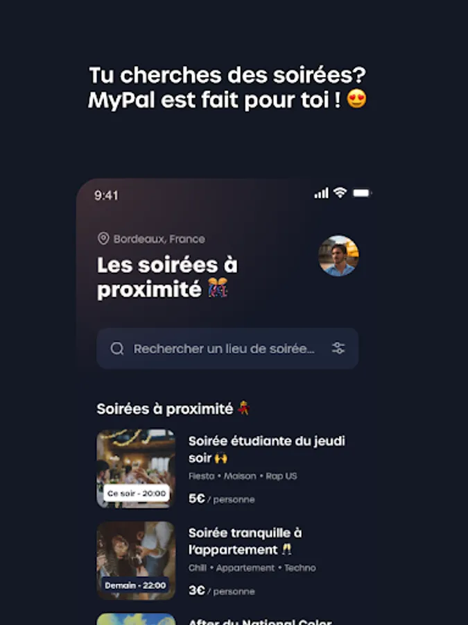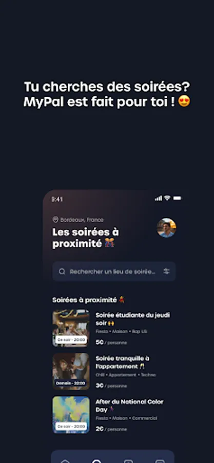 MyPal is a connection application that allows users to find parties at private homes and which also allows them to be able to offer parties at their homes, by choosing to be paid or not, and that, in complete safety.