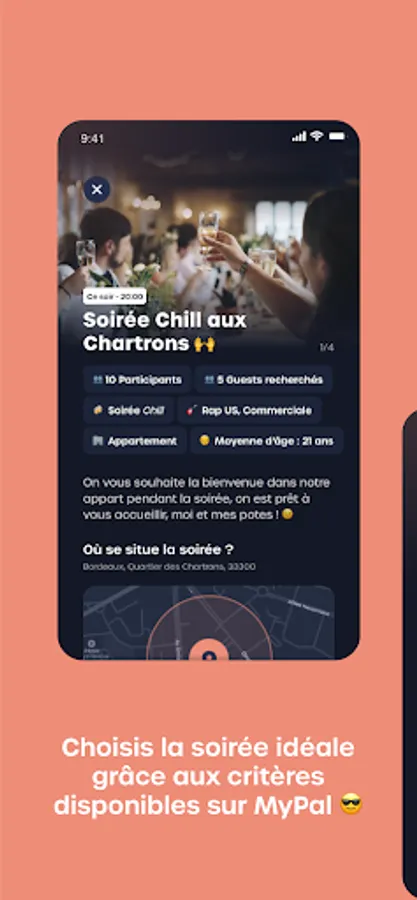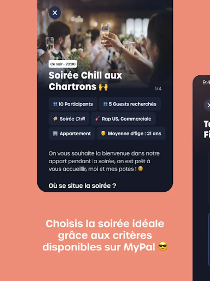 On MyPal, a Guest is a member who is looking for an evening, and a Host is a member who proposes an evening by filling in criteria such as: the date and time of the evening, the place of the evening (apartment, house, single accommodation ), the type of party, photos of the place of the party, the average age of the guests, the number of people present, the number of people wanted, and the type of music. The Host can set a price for his party, or not, depending on the criteria announced.