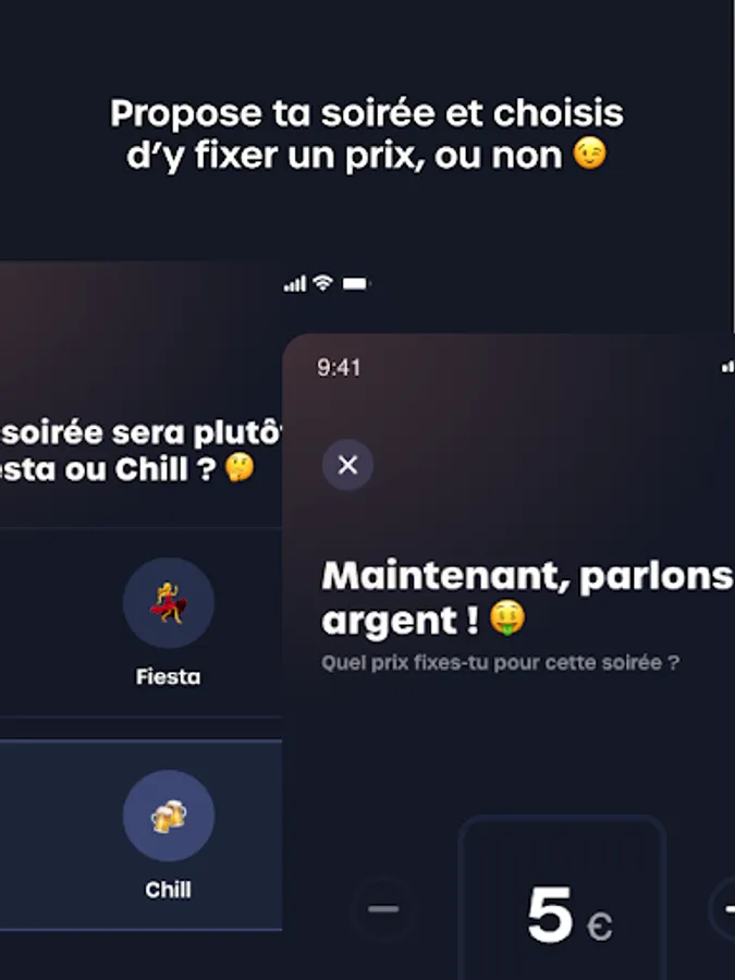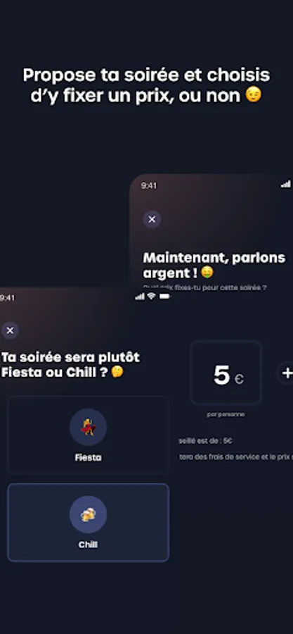 On the application, a Guest can find the perfect evening that suits him as much as possible thanks to the criteria presented by the Host. The Host can offer two types of evenings: a Fiesta, an evening during which the members meet to party. Or a Chill, an evening during which the members meet to spend a relaxing and pleasant evening (meal, music, games, football match, common theme...).