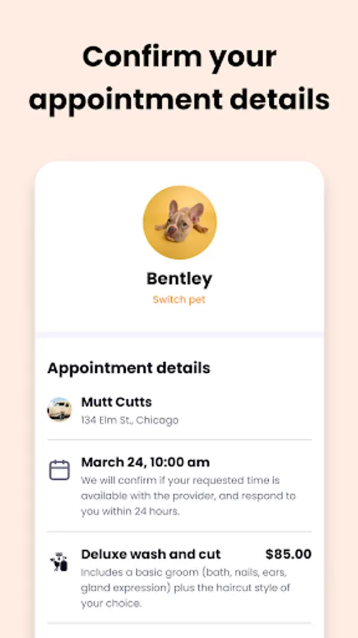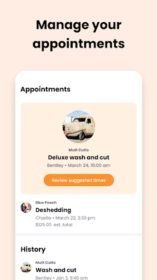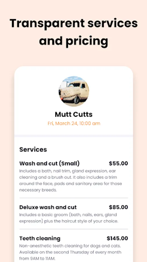 PawCare is here to help you discover, book, and manage your pet's grooming appointments. With PawCare, you no longer need to go through the hassle of calling and emailing providers trying to figure out what services they offer or what they cost. With just a click of a button, you can book, reschedule, and cancel appointments all in one place.