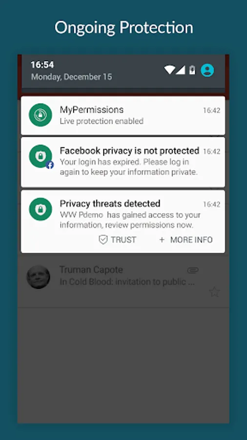 * Alert you as soon as an existing app gains new permission to access your personal information and data is scanned & discovered