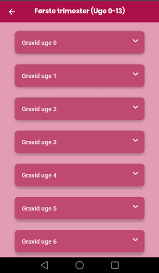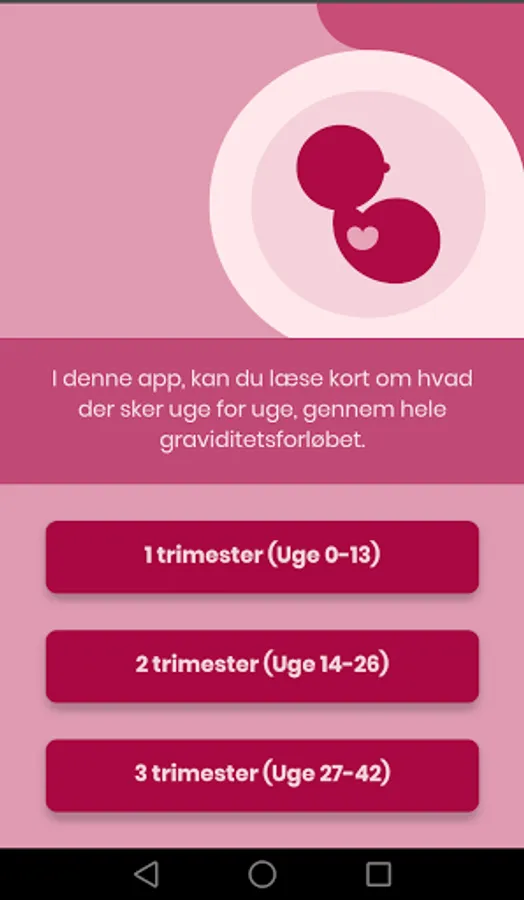 In this pregnancy app you can follow your pregnancy week by week and read small texts about what happens to both you and baby. The small texts should help you to quickly get an overview of what is happening right now in your pregnancy, and hopefully help you stay calm. The app is divided into first, second and third trimesters, so you can quickly find the place you are in your pregnancy.