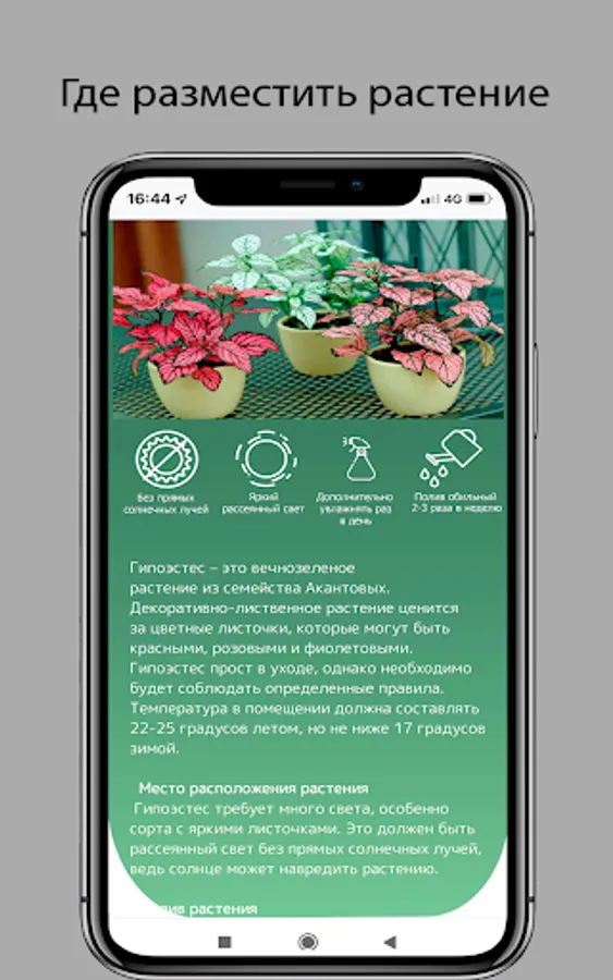 On the card of each plant, you will find a photo, icons that display the key points of plant maintenance (location, features of watering and additional moisture), as well as a description text.