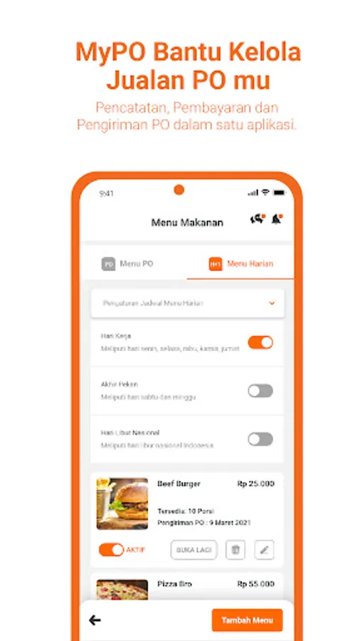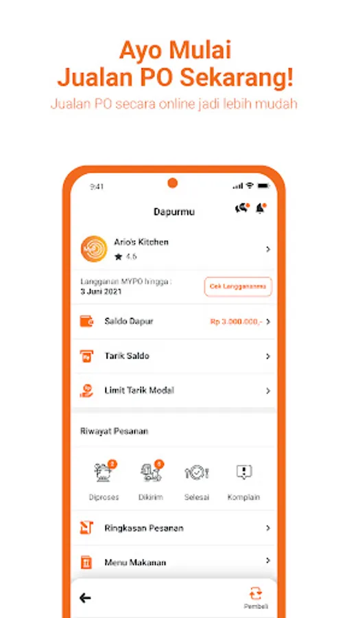 MyPO is the pioneer application for MSME kitchen owners that provides all the facilities for selling online with a pre-order (PO) system, especially food and beverage products, so that transactions become easy, efficient and secure. The MyPO application is especially devoted to helping home kitchen owners, starting from ordering, payment, and also a promotional, so that selling pre-orders is sure.