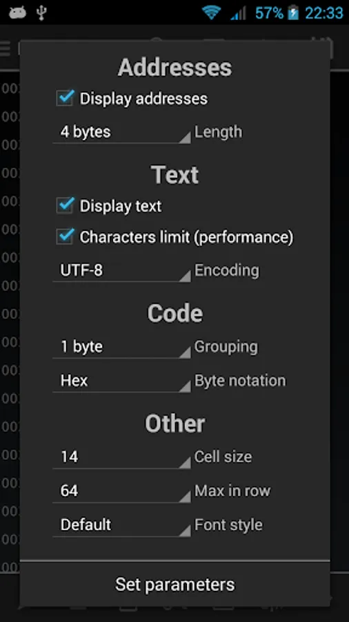 • Displaying data in hexadecimal/decimal/octal, the possibility to change the visible length of the address, as many other tweaks let you customize the viewing