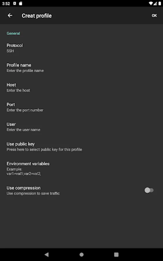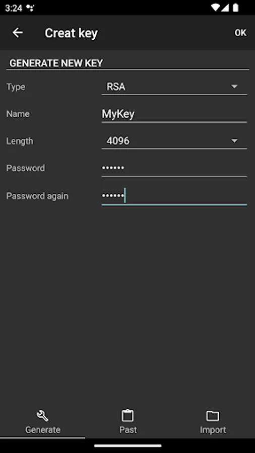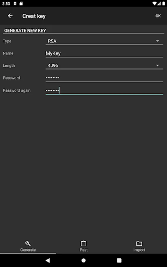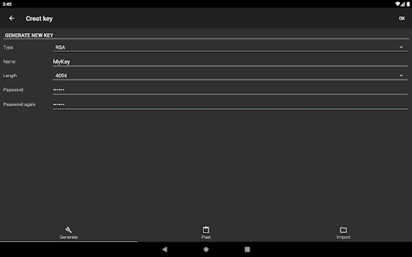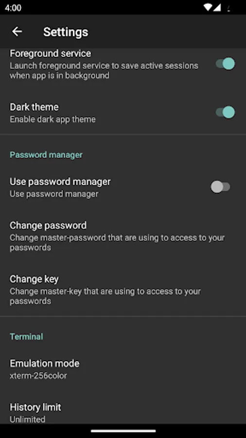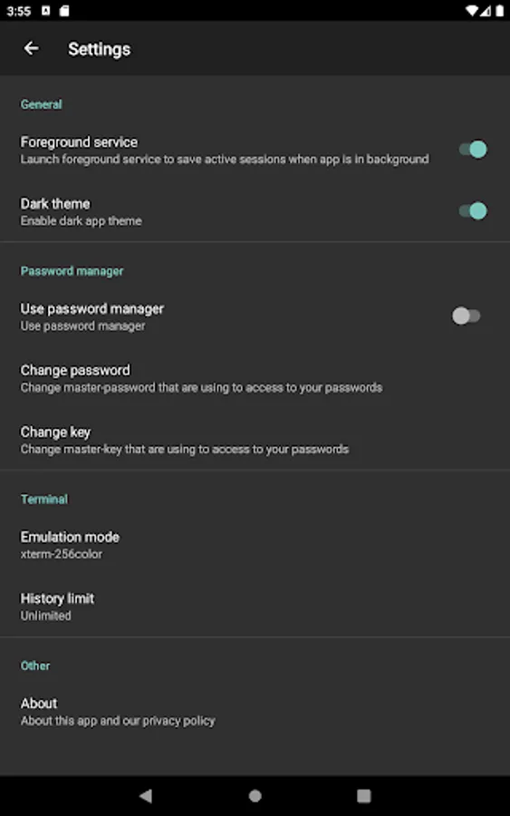 • Thanks to the built-in password manager, you do not have to keep in mind the passwords for each server and key. The password database is stored on the device and encrypted with AES256-CBC using the master key. You can manage the password manager or disable it altogether in the settings.