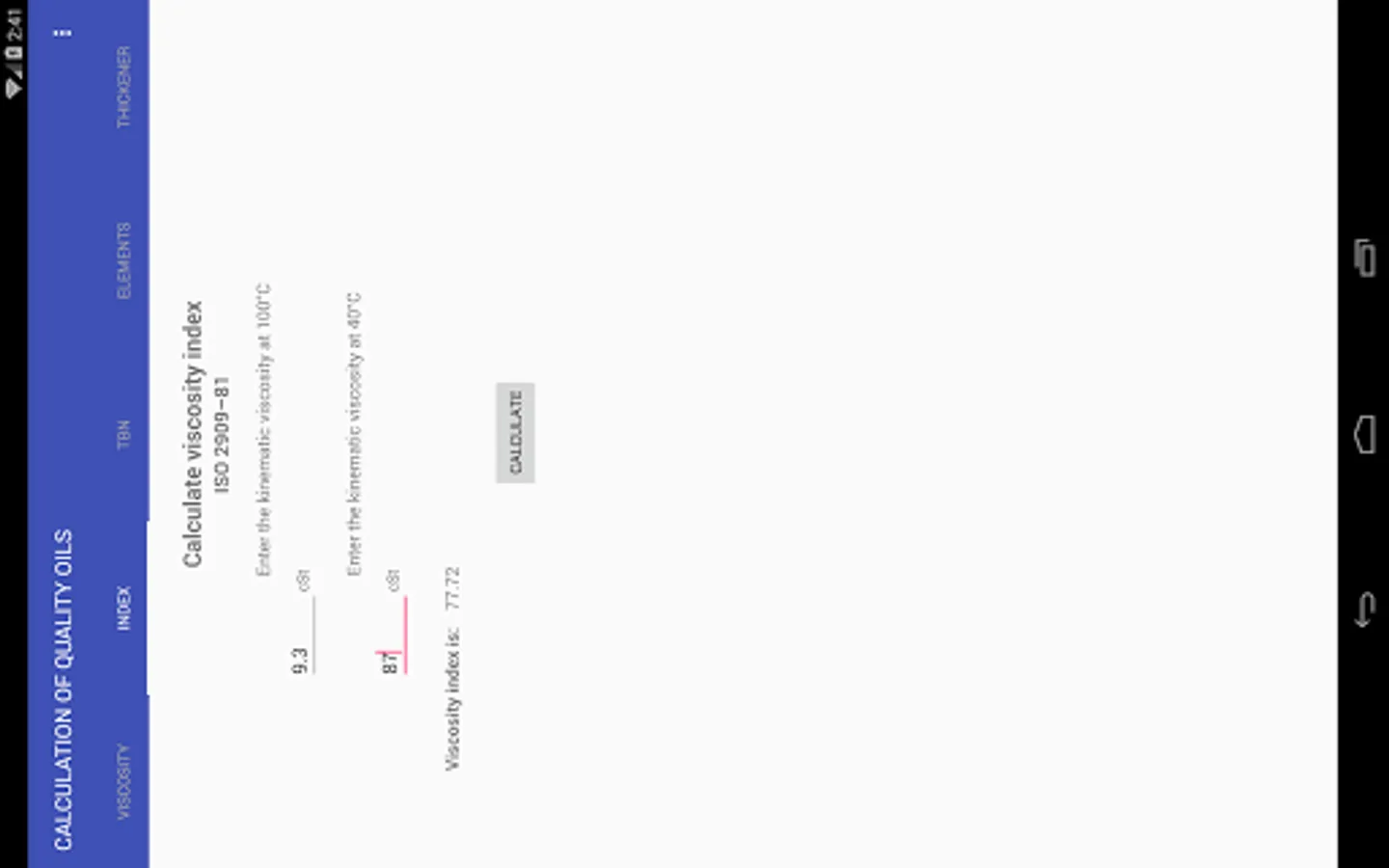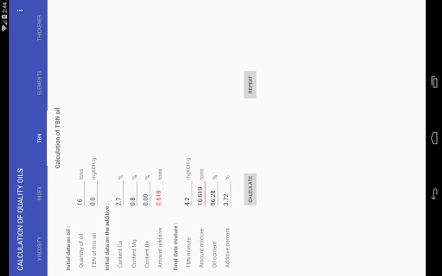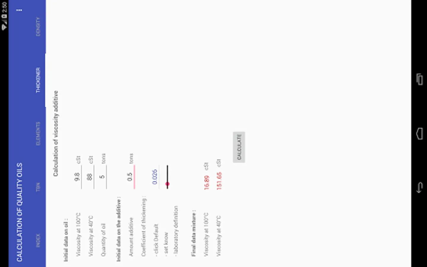 The presented program allows to calculate the predicted values of the quality indicators of technical oils:
