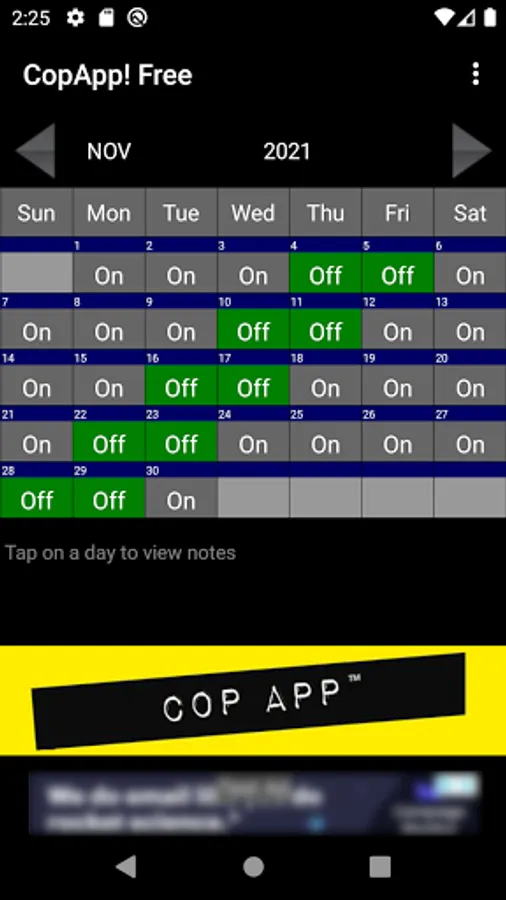 * Enter your rotation days (ex: On,On,On,On,Off,Off), and the calendar will repeat these days indefinitely, starting with "Start Date" in Settings.