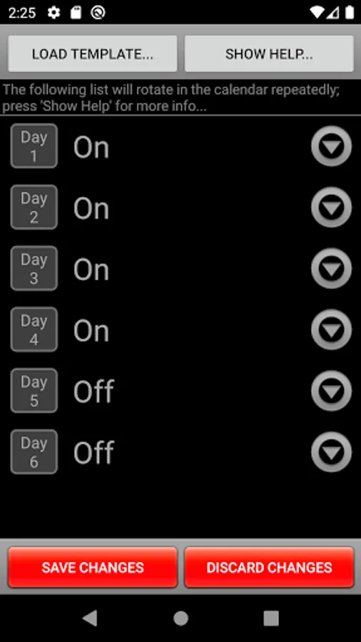 * Customize/rearrange the text for the days in the rotation (Allows app to work for any repeating schedule.) Also added some templates that can be modified, and the ability to load them via the internet.