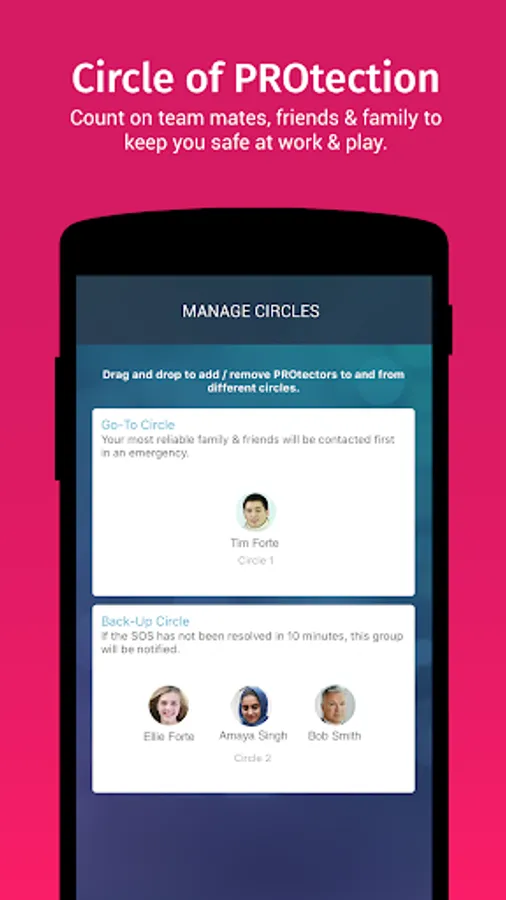 Create circles of trusted PROtectors who will be notified in the event of an emergency so that they can send immediate help. Customize different circles for different situations.