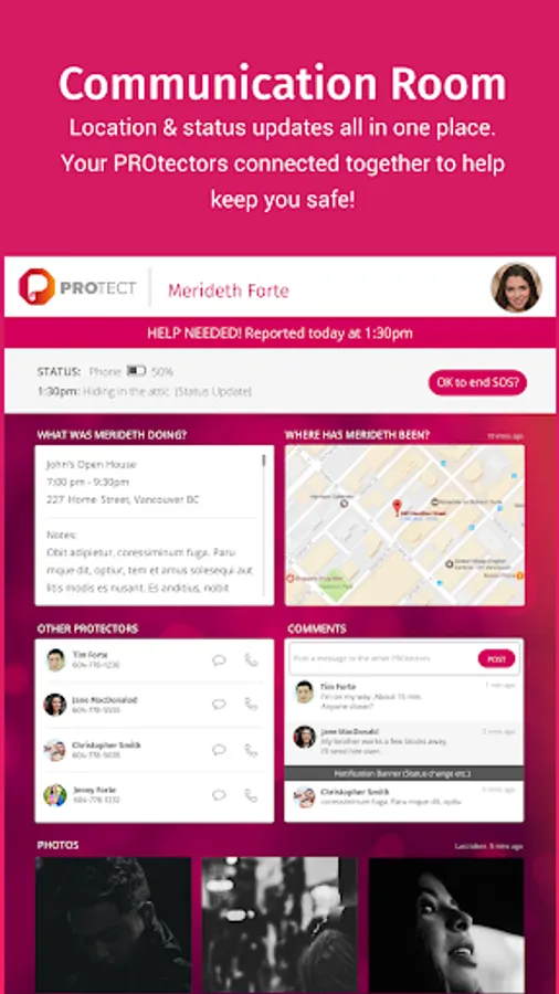 This virtual hub gives your PROtectors instant access to your GPS info, alert messages, status updates and a message board they can use to work together in case of an emergency.