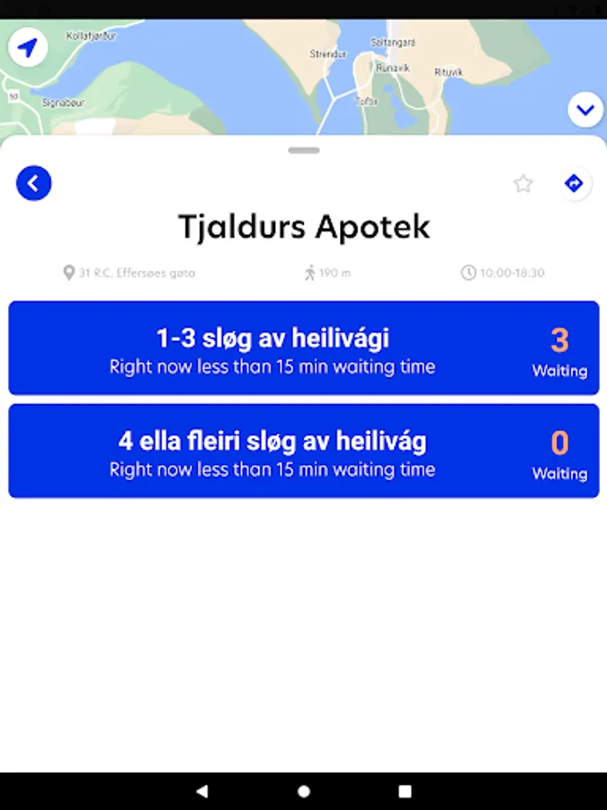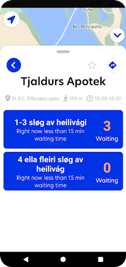 Click on a marker to see more information about that particular store like opening hours and estimated waiting time.