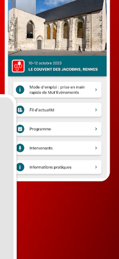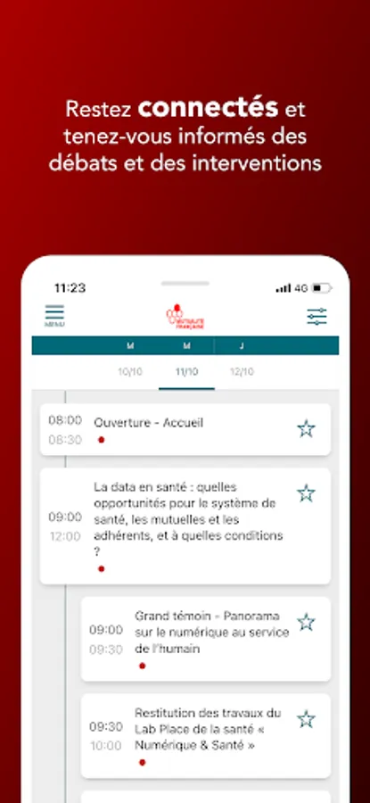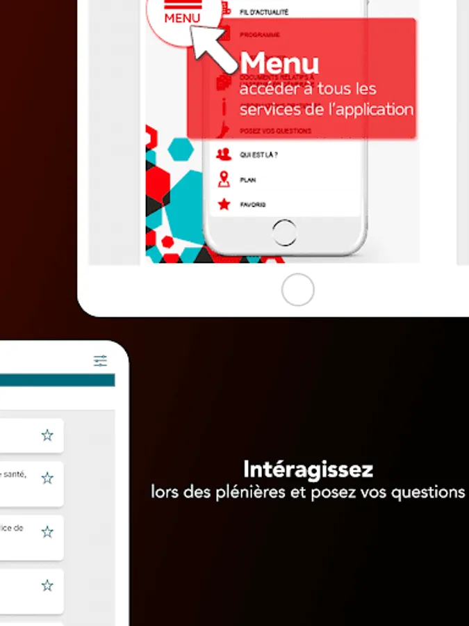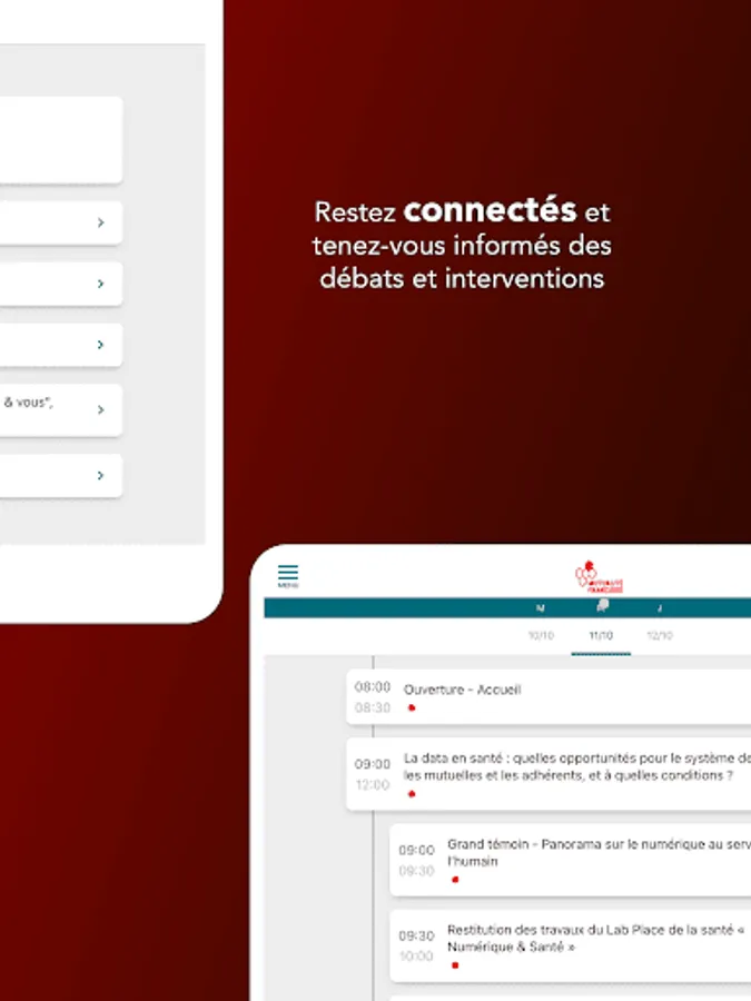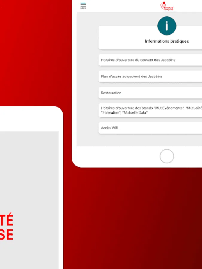 The Mutualité Française event application allows you to find out (practical information, etc.), to find out (about debates, interventions, etc.) and to express yourself (during the plenaries) during major highlights of the Mutualist Movement.