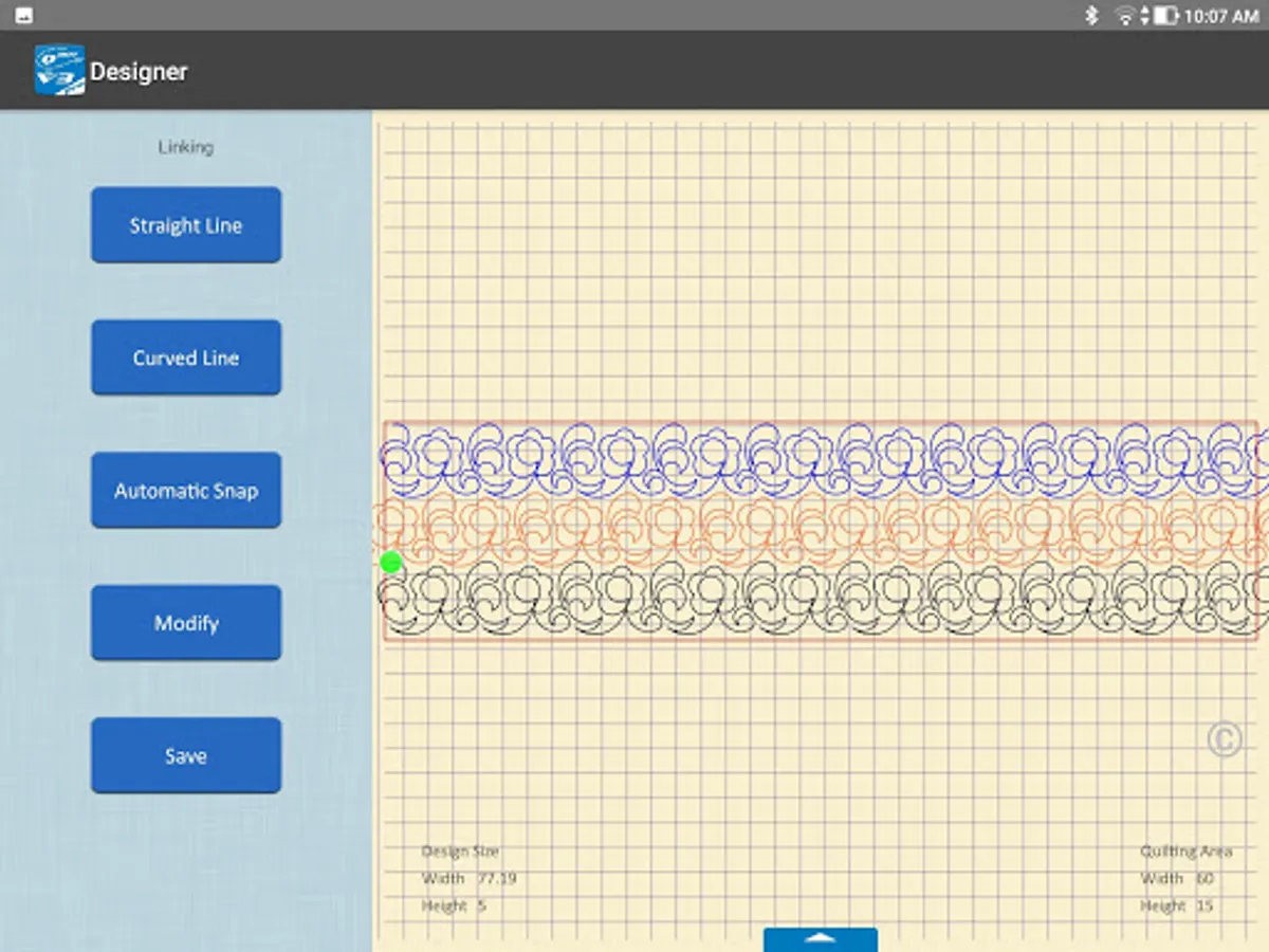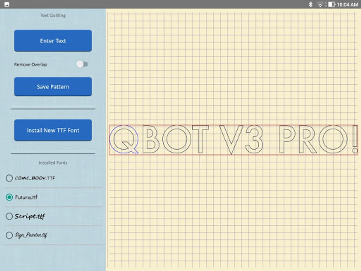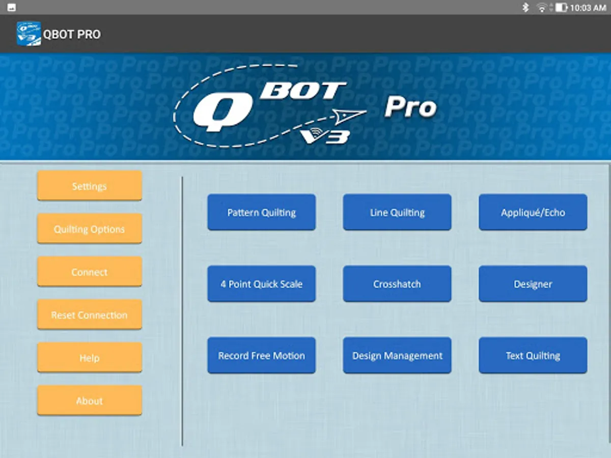 The Pro version of the QBOT V3 app is a companion app for V3-enabled QBOT heads. Includes all the features of the QBOT V3 app and adds several new features. The new Four Point Quick Scale includes margin control for a more professional look. The Smart Fit function with margin control automatically morphs edge-to-edge and border designs into 'less than perfect' sashes and borders. The powerful Text Quilting feature allows you to type any text and QBOT will automatically convert the text to a quilting design ready for quilting. Four fonts are included with the app and any True Type font can be installed for your own custom effect. Overlapping letters are automatically merged at the push of a button. The new Designer feature allows you to build, link, and trim multiple rows of edge-to-edge designs together - along with direction reversal - so you can quilt multiple rows at one shot.