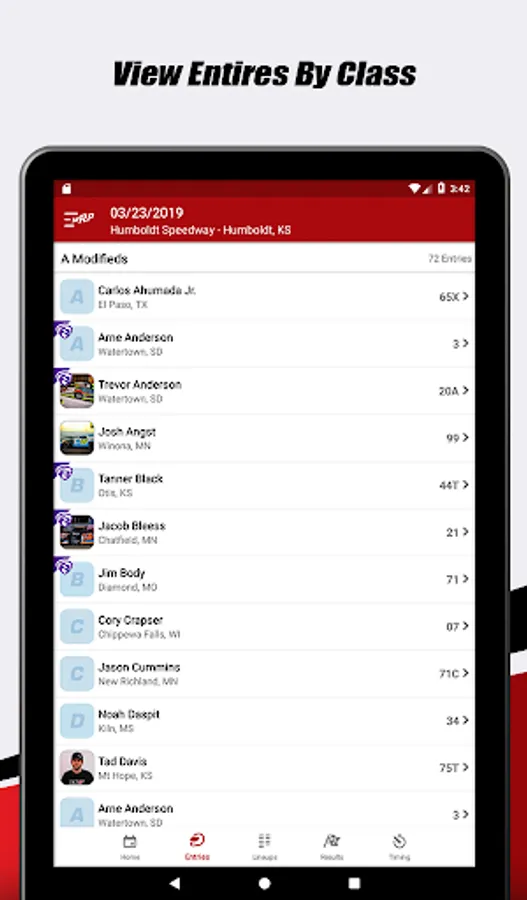 - Touch a driver in the entry list for an overview of their event