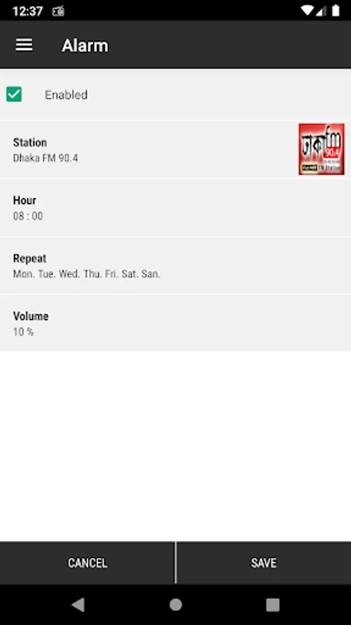 + Use your app as Ann alarm by choosing the station to broadcast, activation days and playback volume.
