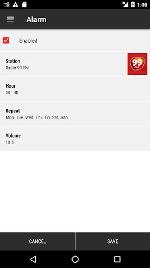 + Use your app as Ann alarm by choosing the station to broadcast, activation days and playback volume.