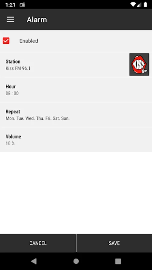 + Use your app as Ann alarm by choosing the station to broadcast, activation days and playback volume.
