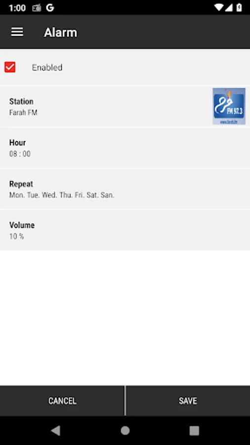 + Use your app as Ann alarm by choosing the station to broadcast, activation days and playback volume.