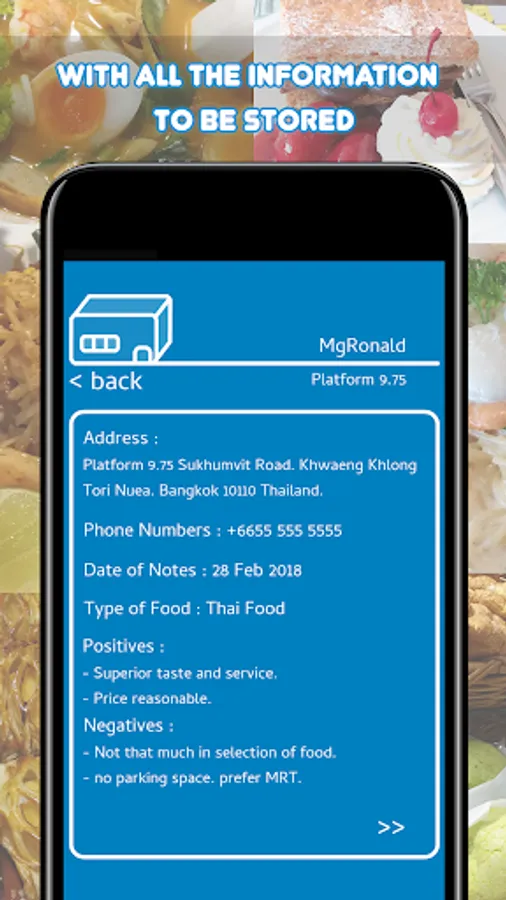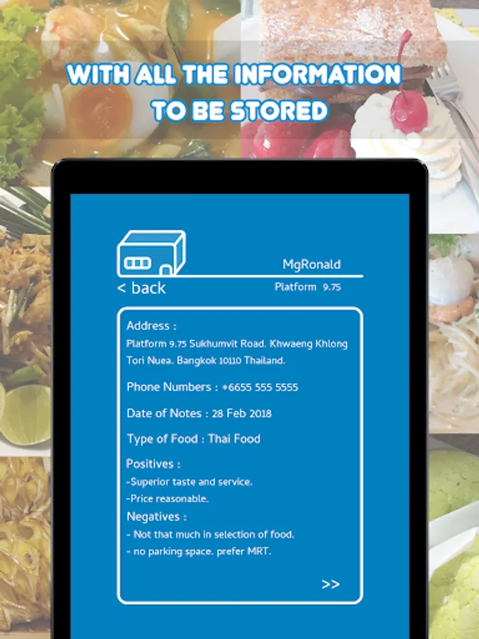 - Address, Phone numbers, Dates, Type of food, Positives, Negatives