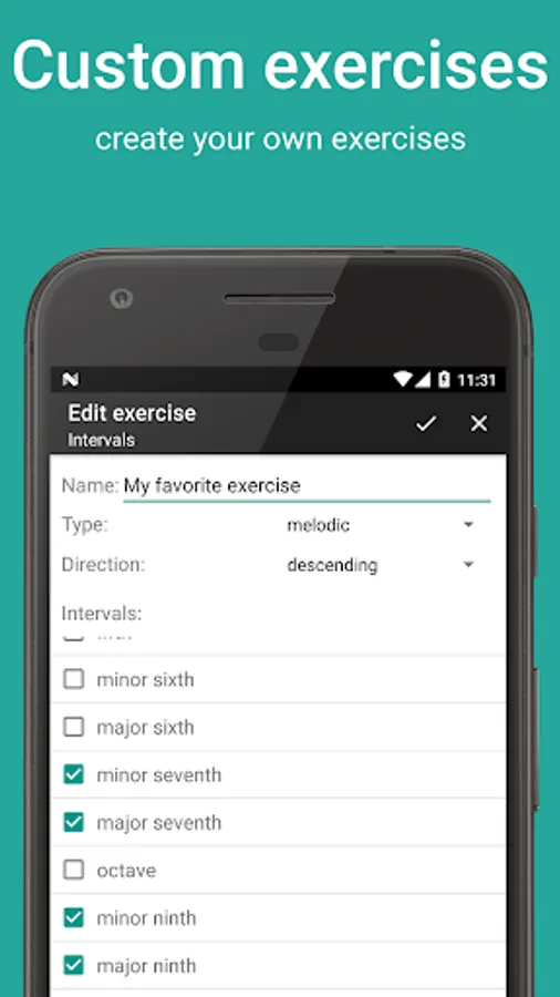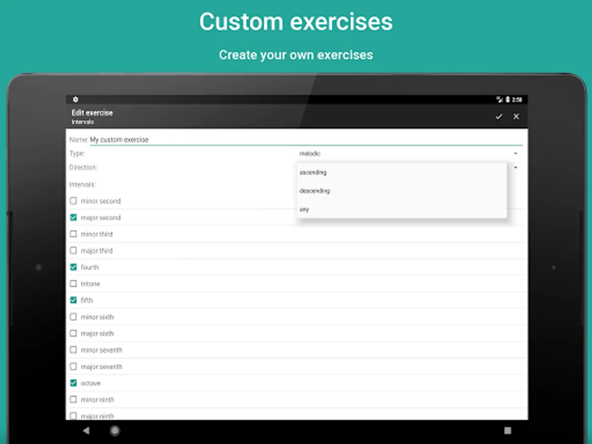 - Intervals training - melodic or harmonic, ascending or descending, compound intervals (up to double octave)