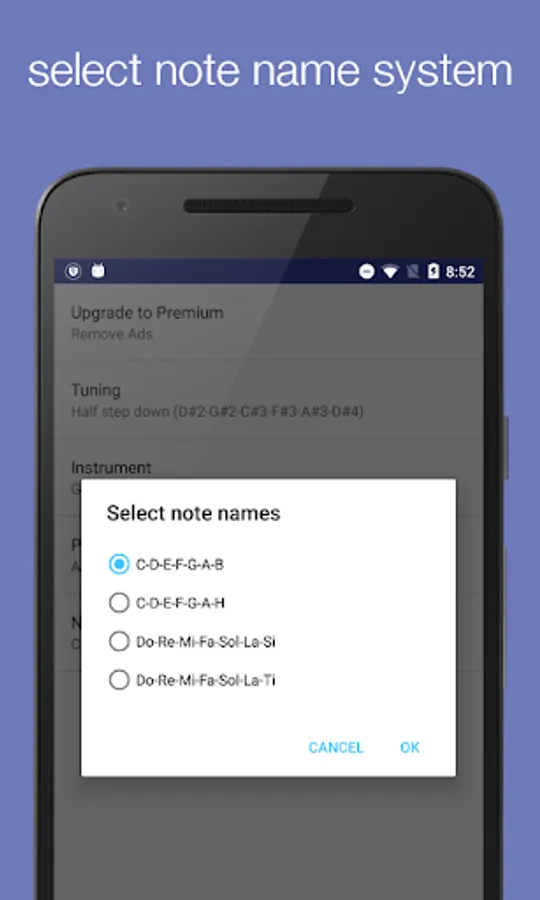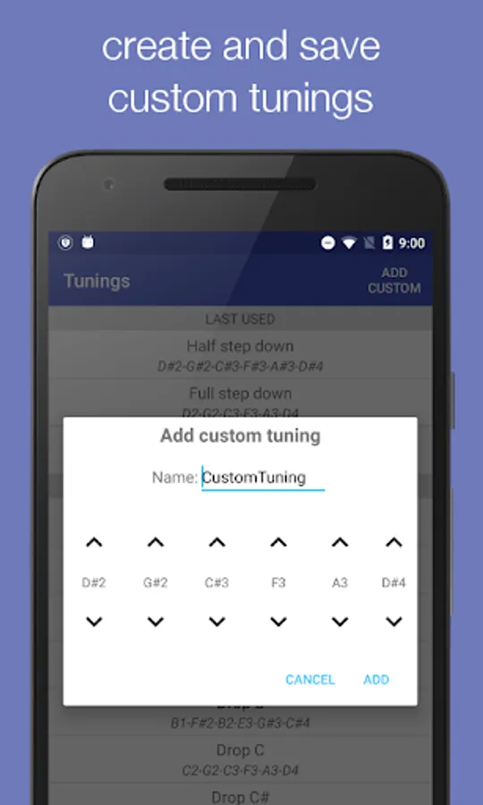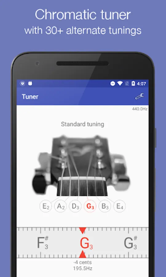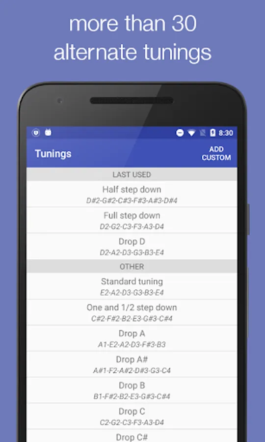 • Use one of the 30+ built-in alternate guitar tunings (Open, Dropped, Double Dropped, Minors, Fourths...) or create your own custom tuning.