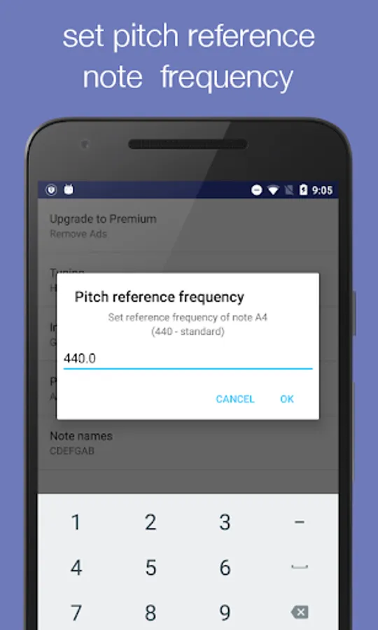 • Adjustable reference note frequency (A440), algorithm sensitivity, and tolerance (in cents).
