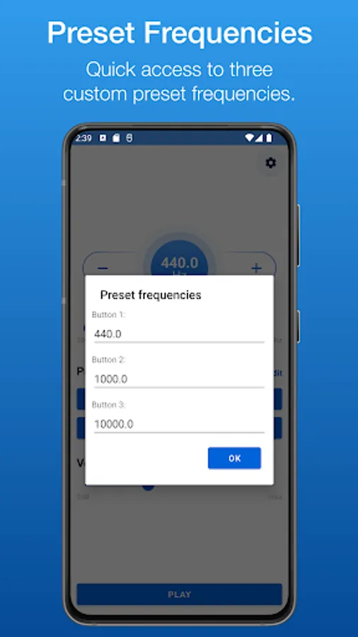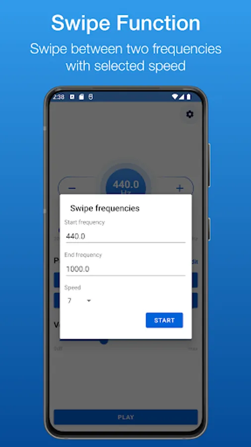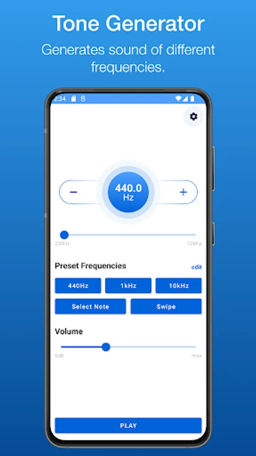 Download Tone Generator for free on your device, utilize the slider to choose the specific frequency, adjust the volume, and hit the Play button.