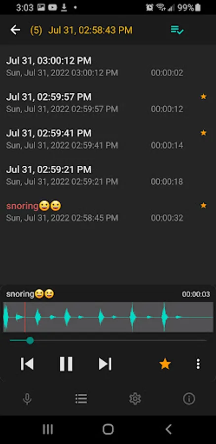 * All recordings are marked with the exact occurrence time, helping users to know when their snoring started, when it ended, and the exact duration, etc., so as to understand the sleep breathing state.
