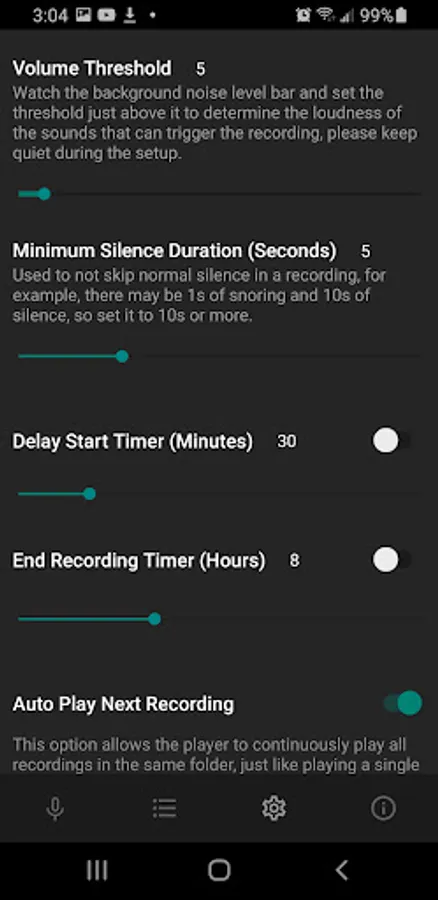 Specifically designed for sleep recording, it automatically skips silence after setting a threshold, perfect for capturing snoring and sleep / dream talk. Delay start before falling asleep, set timer to turn off recording, simple and easy to use.
