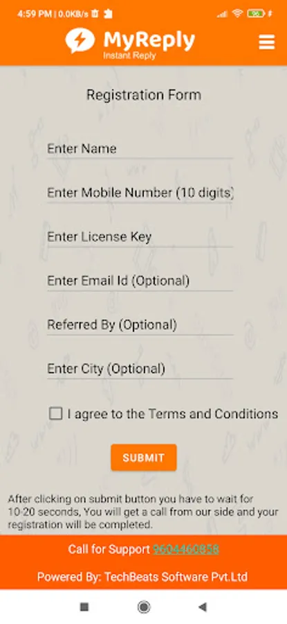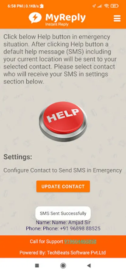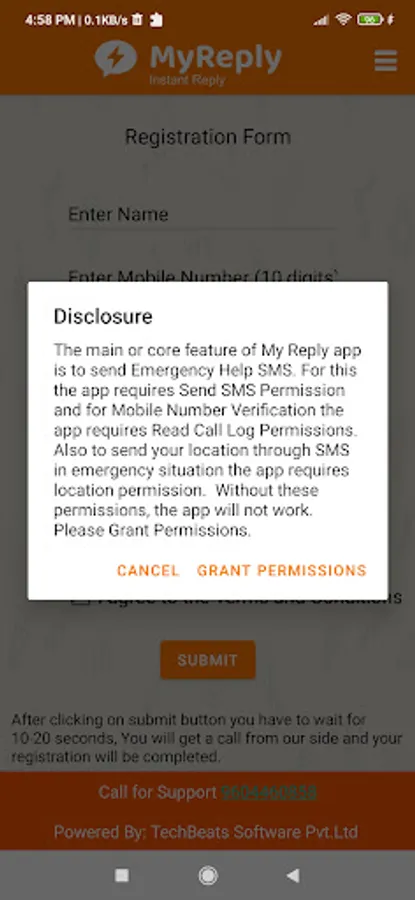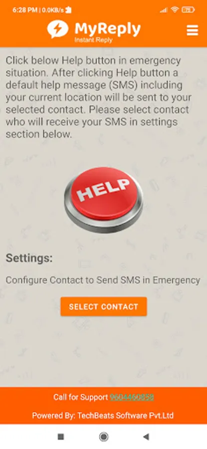 The main or core feature of My Reply app is to send Emergency Help SMS and Whatsapp message. For this the app requires Send SMS Permission and for Mobile Number Verification the app requires Read Call Log Permissions. Also to send your location through SMS in emergency situation the app requires location permission. To send auto whatsapp message in emergency situation app requires Accessibility Service permission.