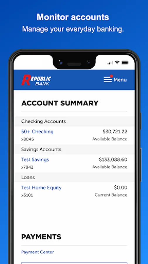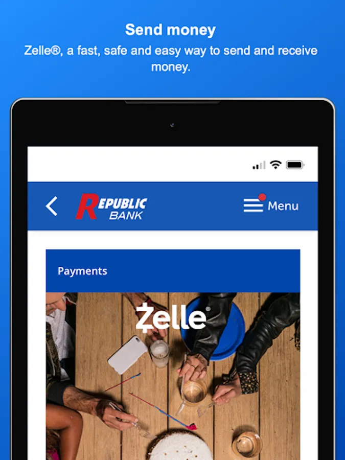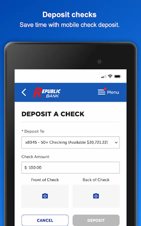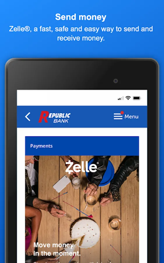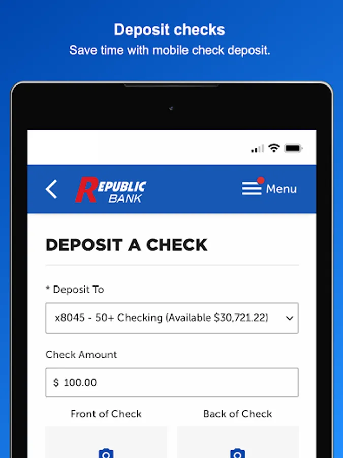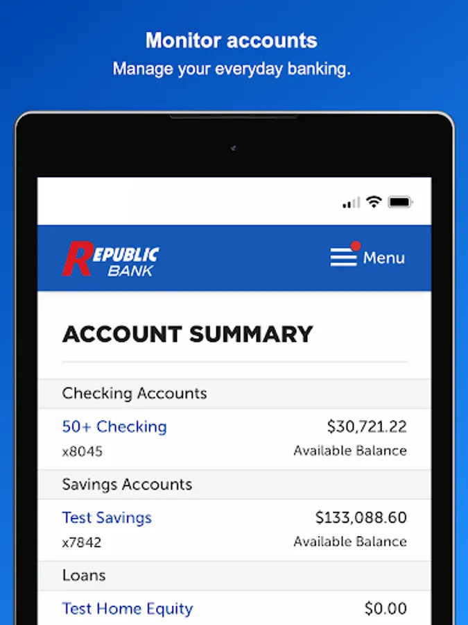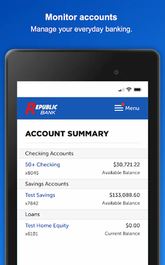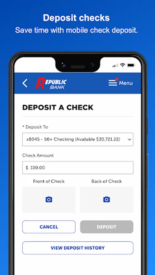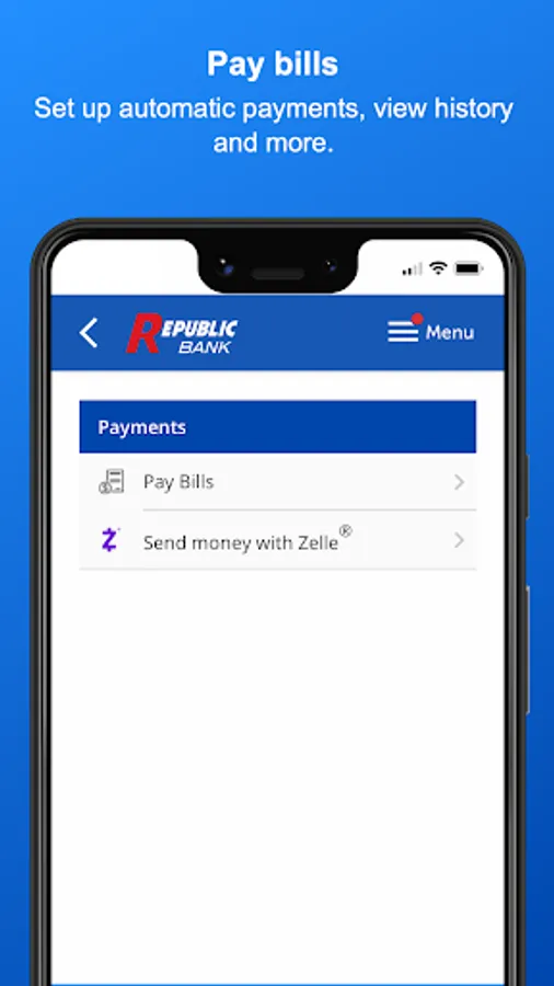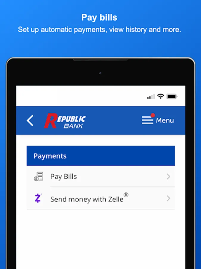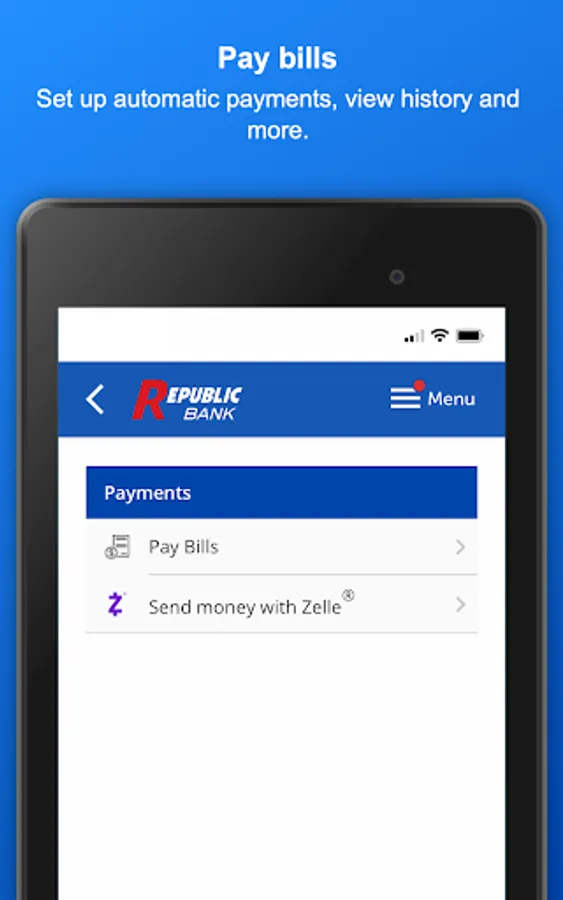 Use the My Republic Bank mobile app to check your balances, pay bills, transfer funds, with just a few taps. You can even activate or freeze your Republic Bank VISA® Debit Card. Connectivity and usage rates may apply, check with your provider for details.