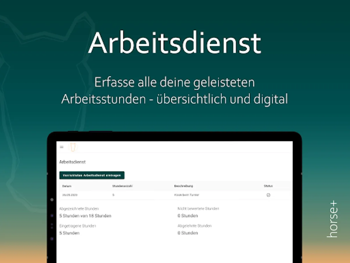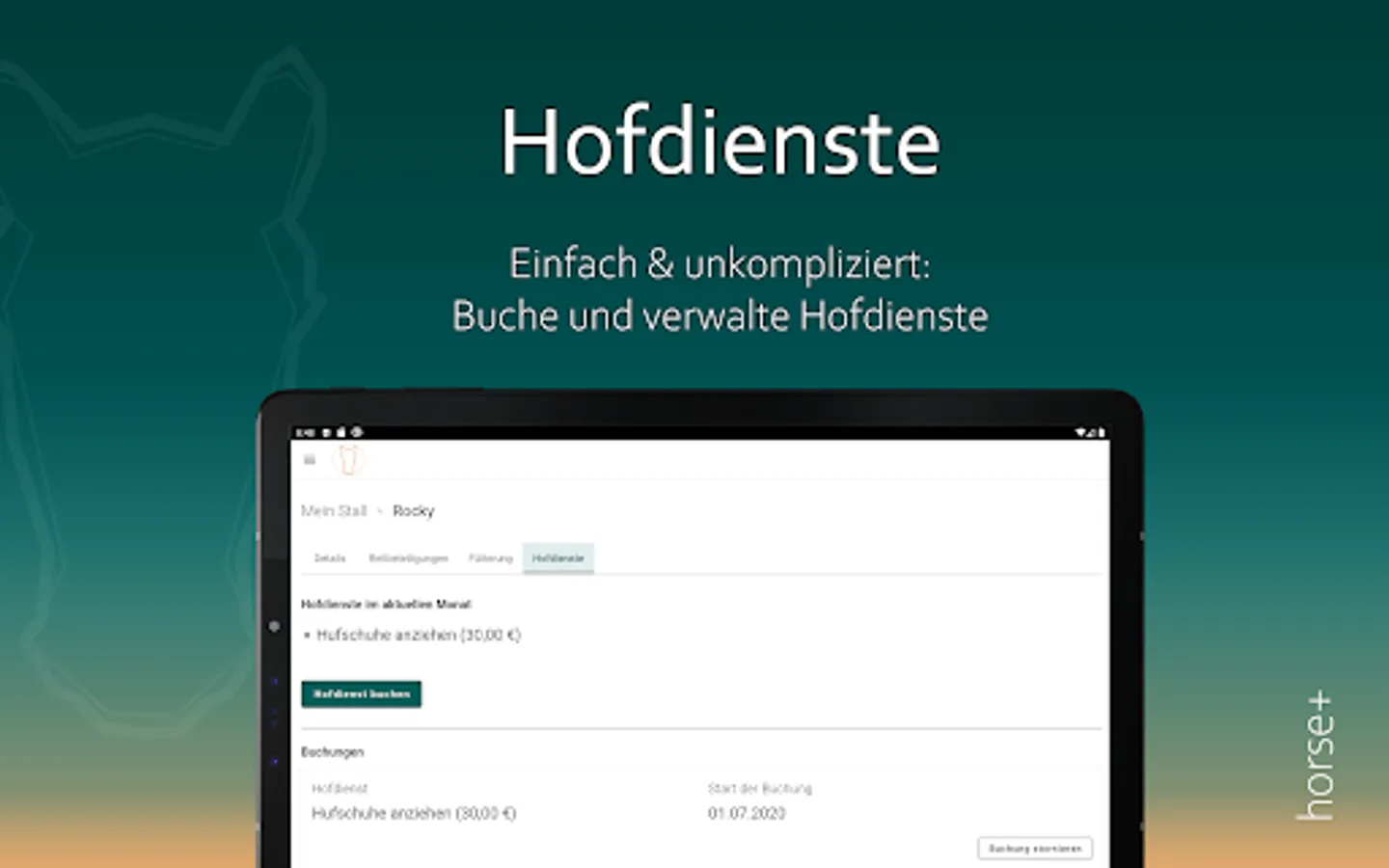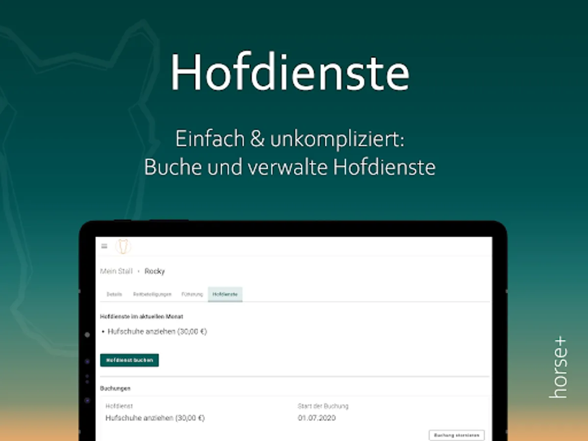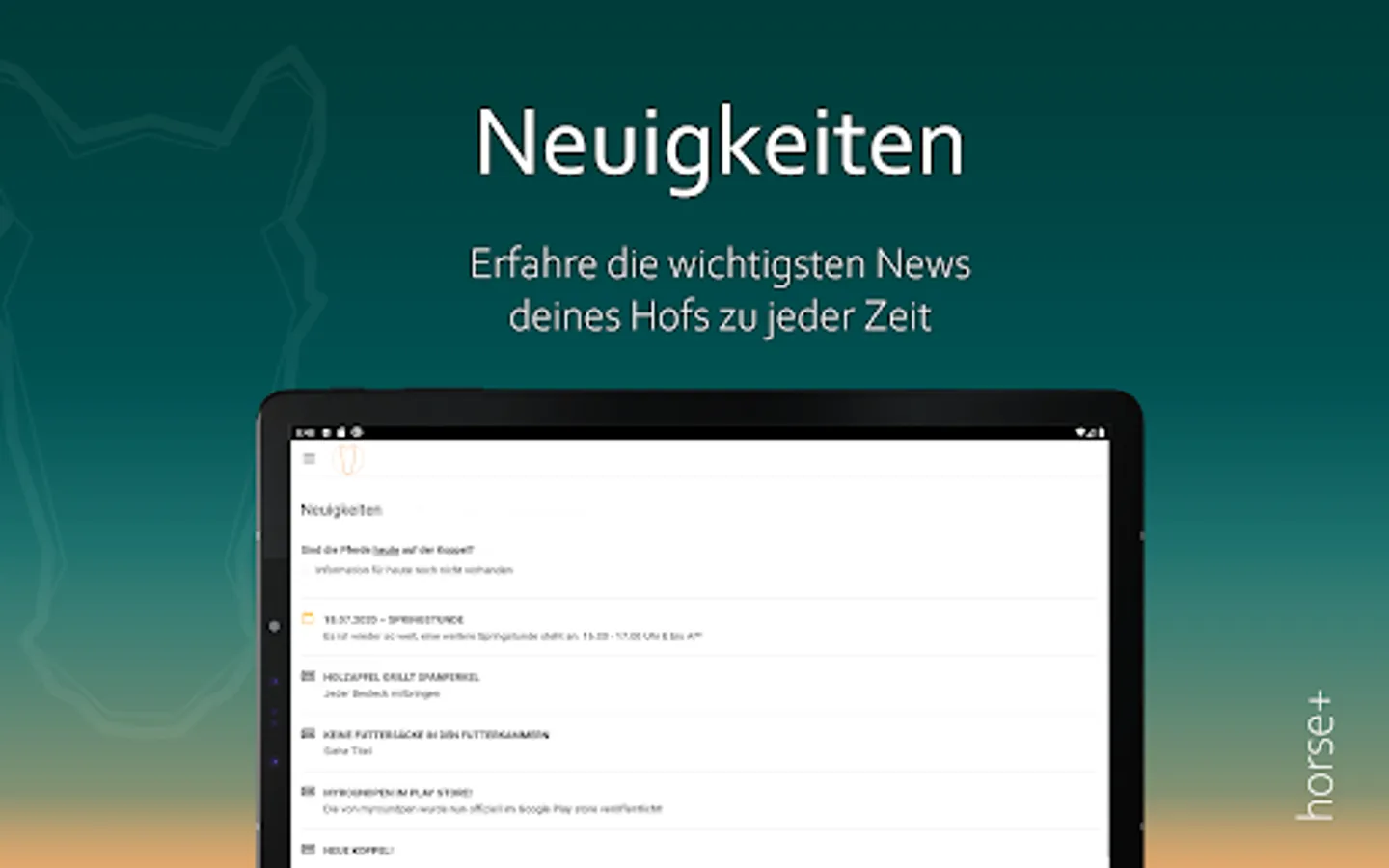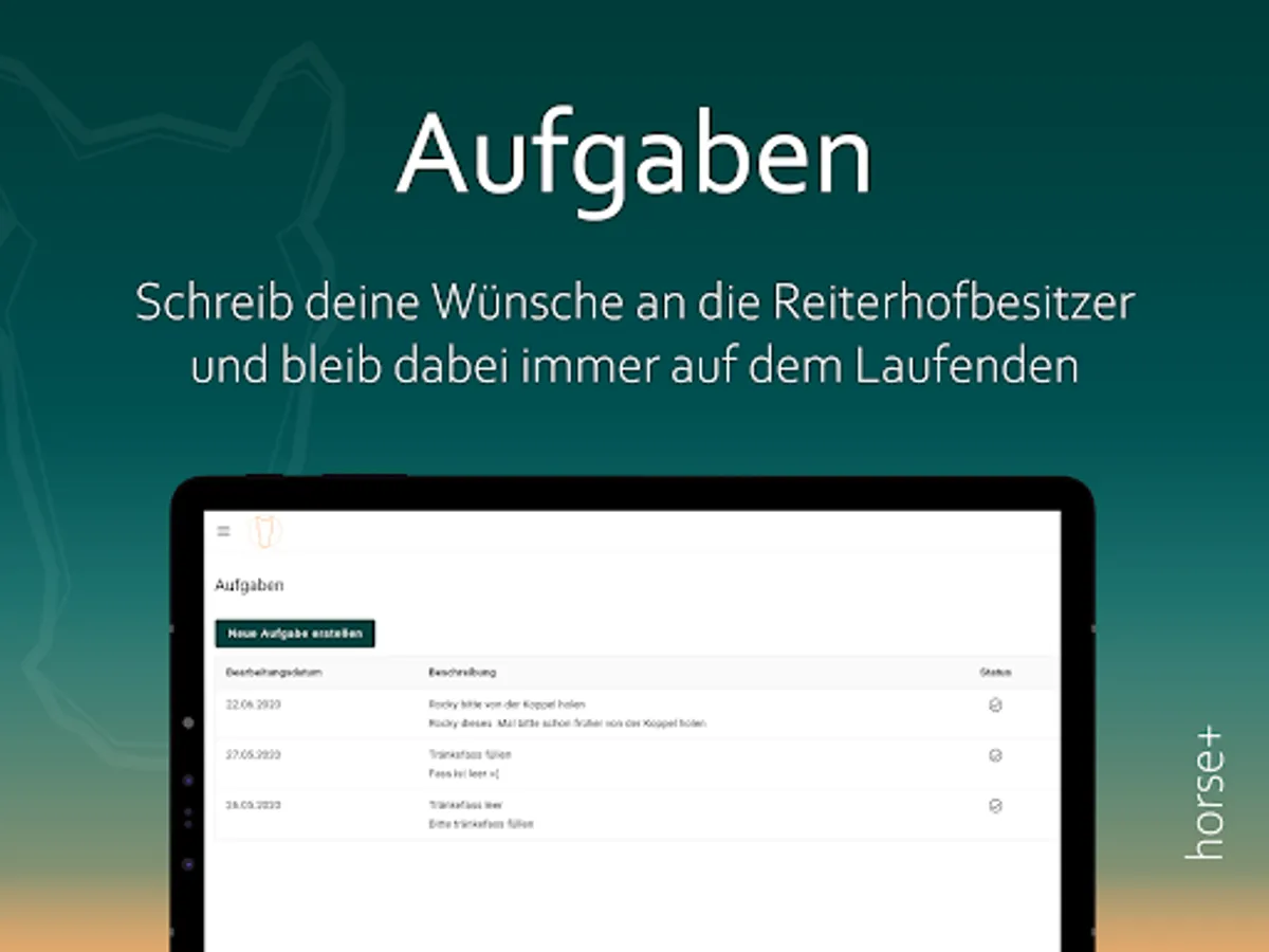 Planning your visit to the riding stables at any time, from home or on the go, easily possible with your own access, whether as an exhibitor or riding participation. In addition, adjustment of all options related to your horse, e.g. from feeding, bedding and other services. The confirmation of the tournament, the summer festival or the feedback on the worming are possible at any time. Farewell to long chat messages - you send your requests directly to the farm owners and always see their status. All information about the horse at a glance via horse+ / horseplus and always adaptable.