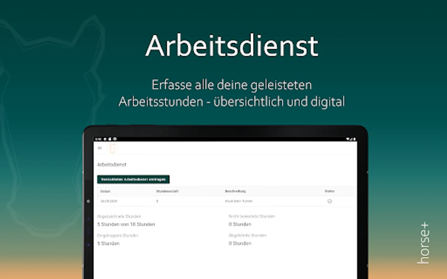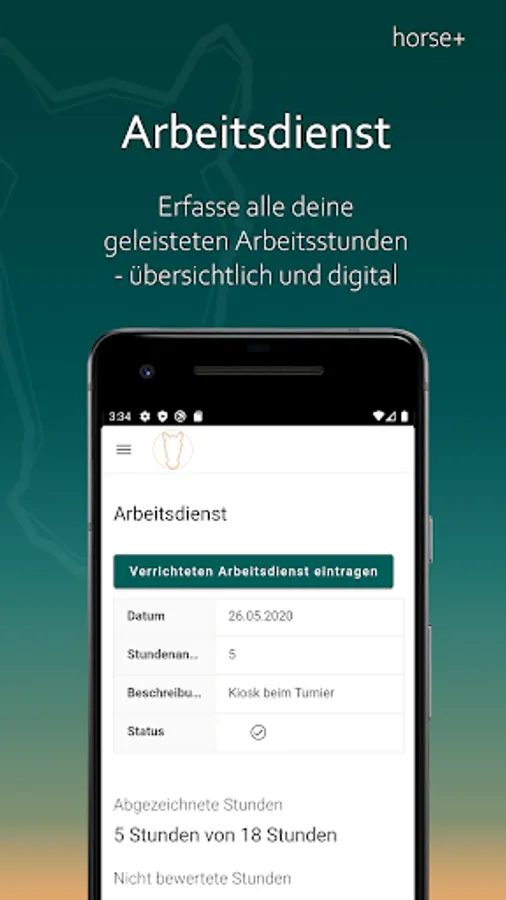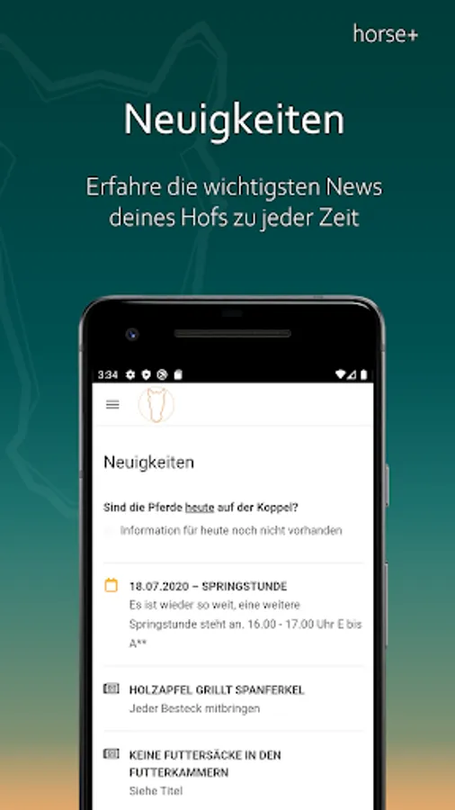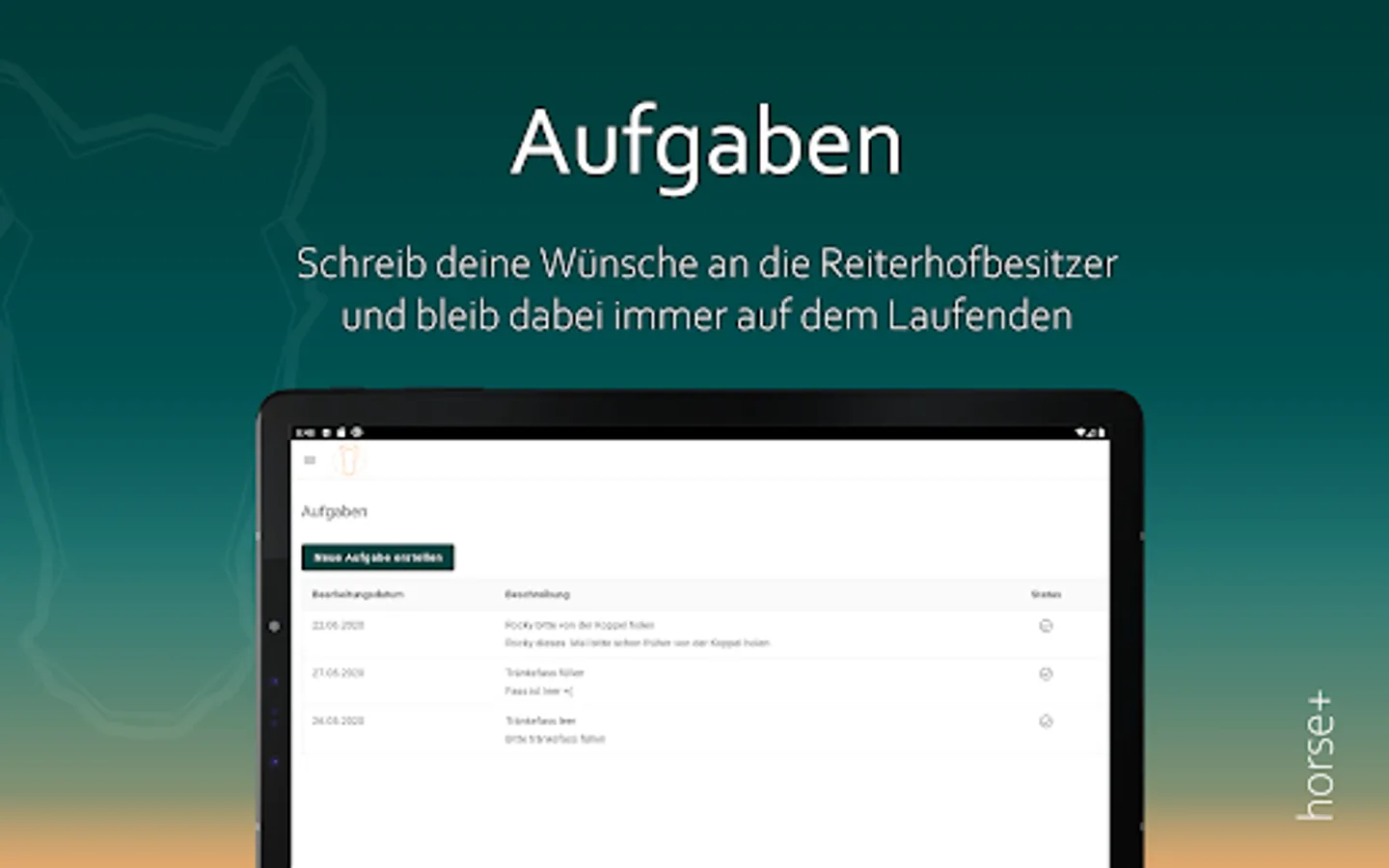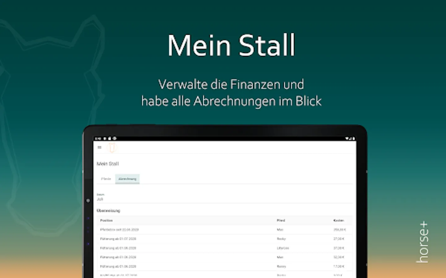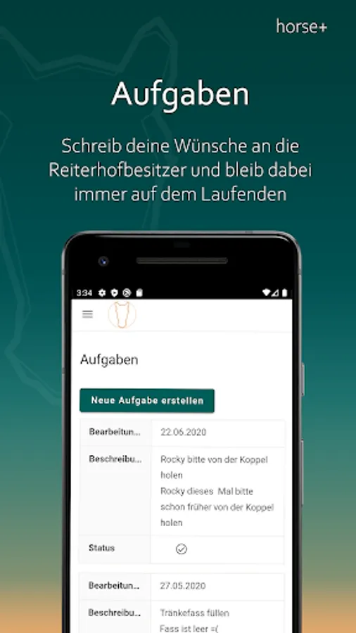 Planning your visit to the riding stables at any time, from home or on the go, easily possible with your own access, whether as an exhibitor or riding participation. In addition, adjustment of all options related to your horse, e.g. from feeding, bedding and other services. The confirmation of the tournament, the summer festival or the feedback on the worming are possible at any time. Farewell to long chat messages - you send your requests directly to the farm owners and always see their status. All information about the horse at a glance via horse+ / horseplus and always adaptable.