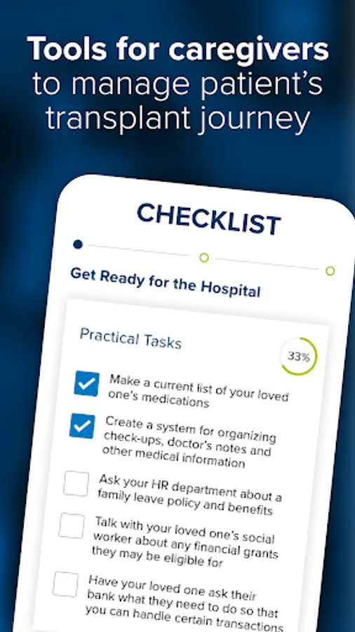 Caregivers can keep a list of their loved one’s medications, past hospitalizations and other important notes. The app also offers a to-do list of common tasks a caregiver may need before, during and after transplant.