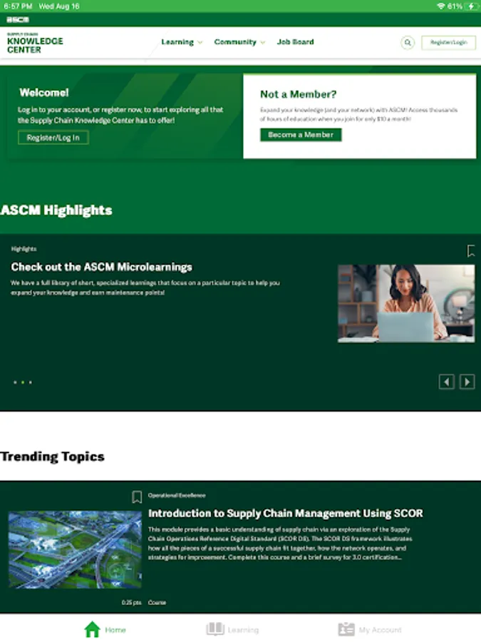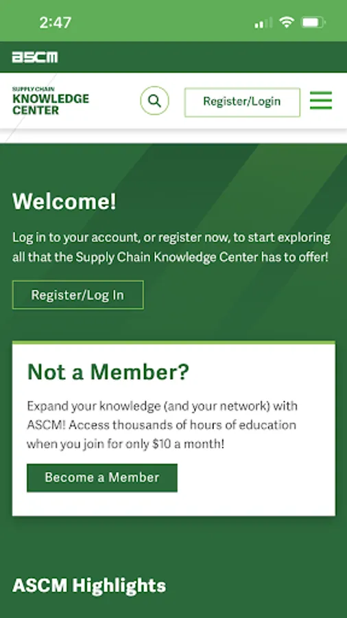 ASCM members have full access to everything available, including mentors, volunteer opportunities, certification maintenance dashboard and more. If you’re not an ASCM member, you can still use the Supply Chain Knowledge Center with limited access.