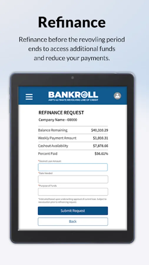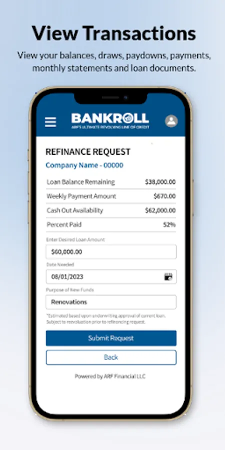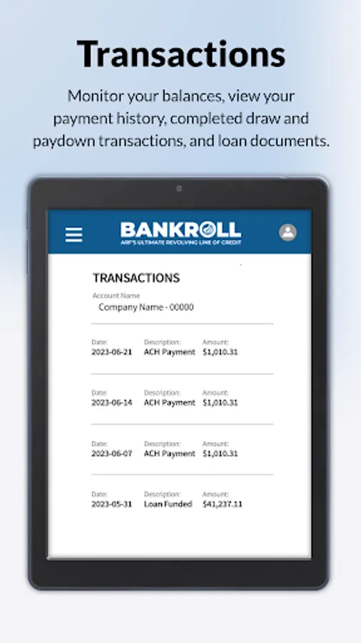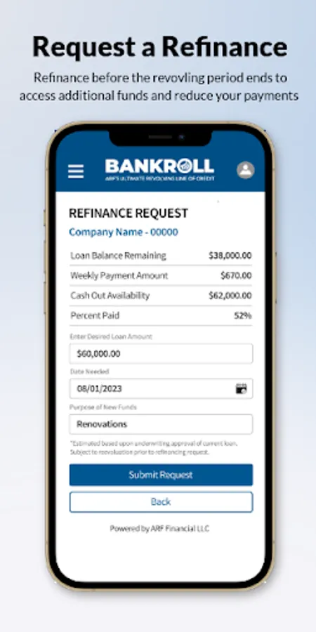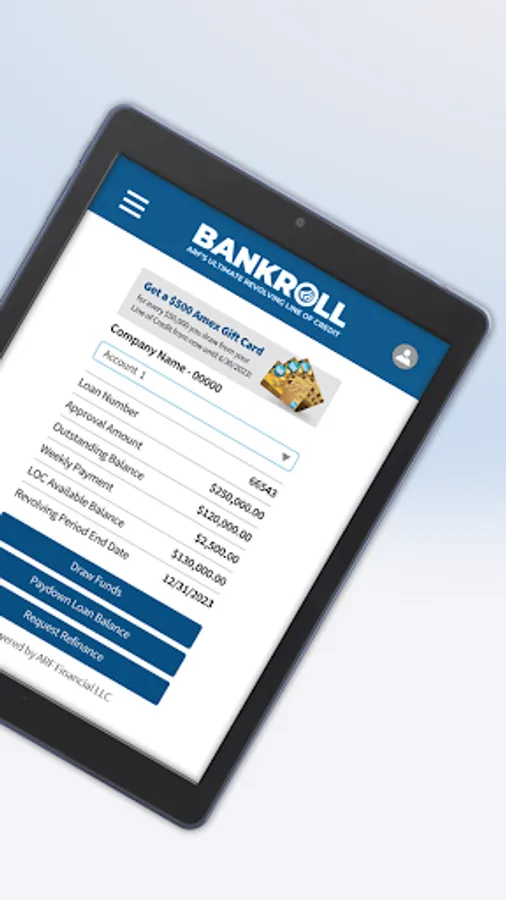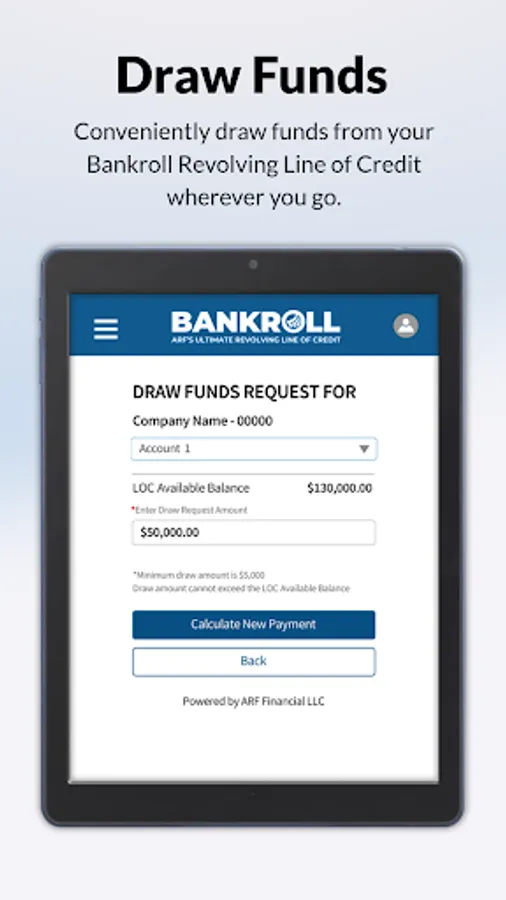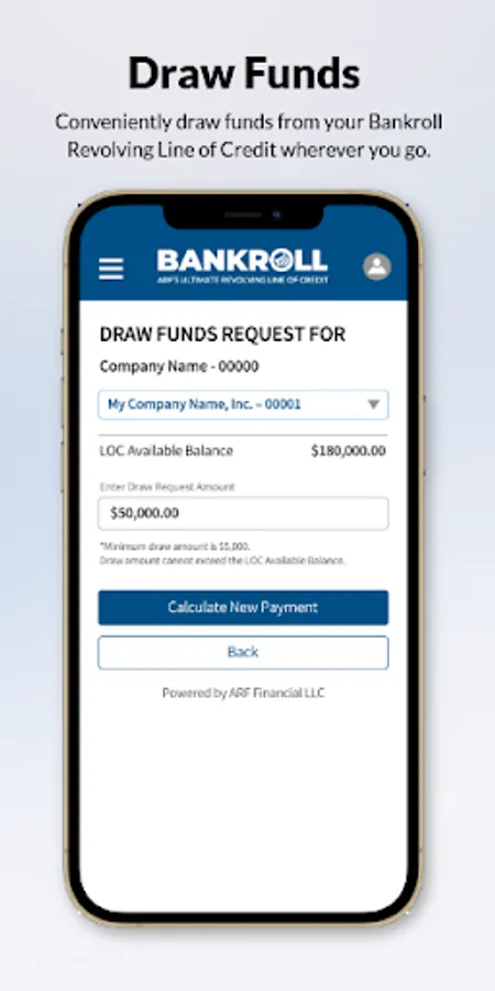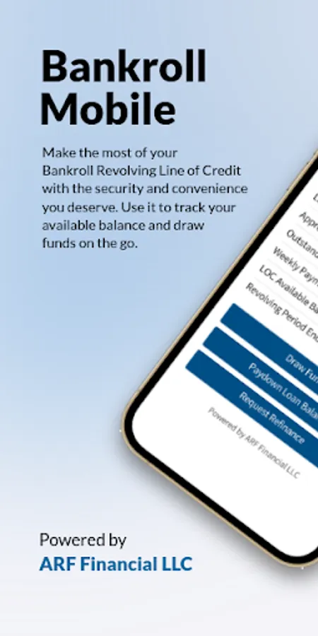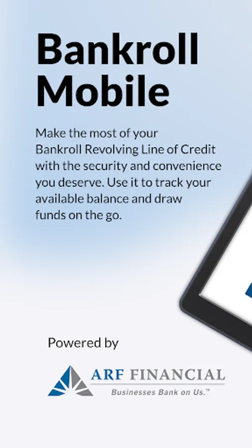 ARF Financial’s Bankroll Mobile App gives you the ability to access your loan account everywhere you go. Monitor your available balance, draw additional funds, view transactions, statements and even pay down your loan’s principal balance right from your phone. Plus, you’ll receive exclusive offers only available on the app. Make the most of your Bankroll Revolving Line of Credit with the speed, security and convenience you deserve! Download today to get access to Bankroll on the go.